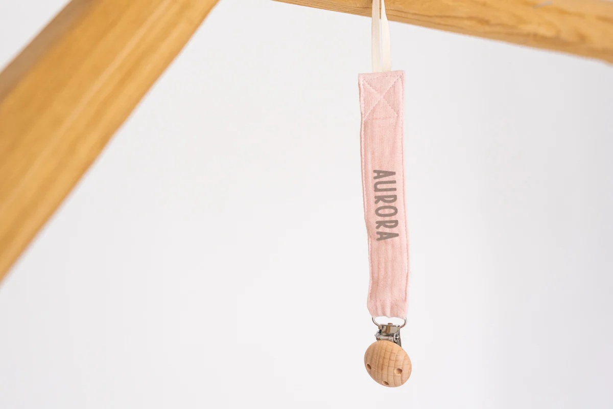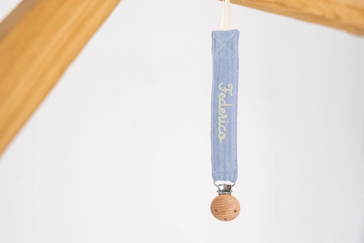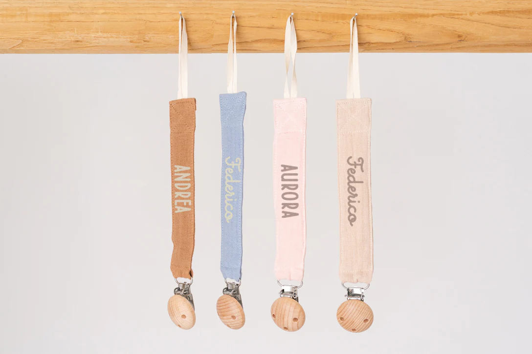 Il nostro cinturino ciuccio in cotone organico รจ personalizzato a ricamo con il nome desiderato ed รจ un regalo fantastico e unico per la nascita o un regalo per il bambino per il baby shower.