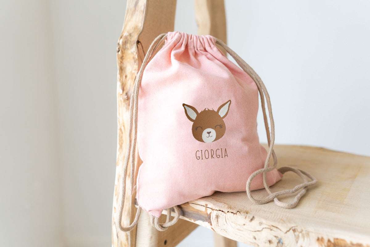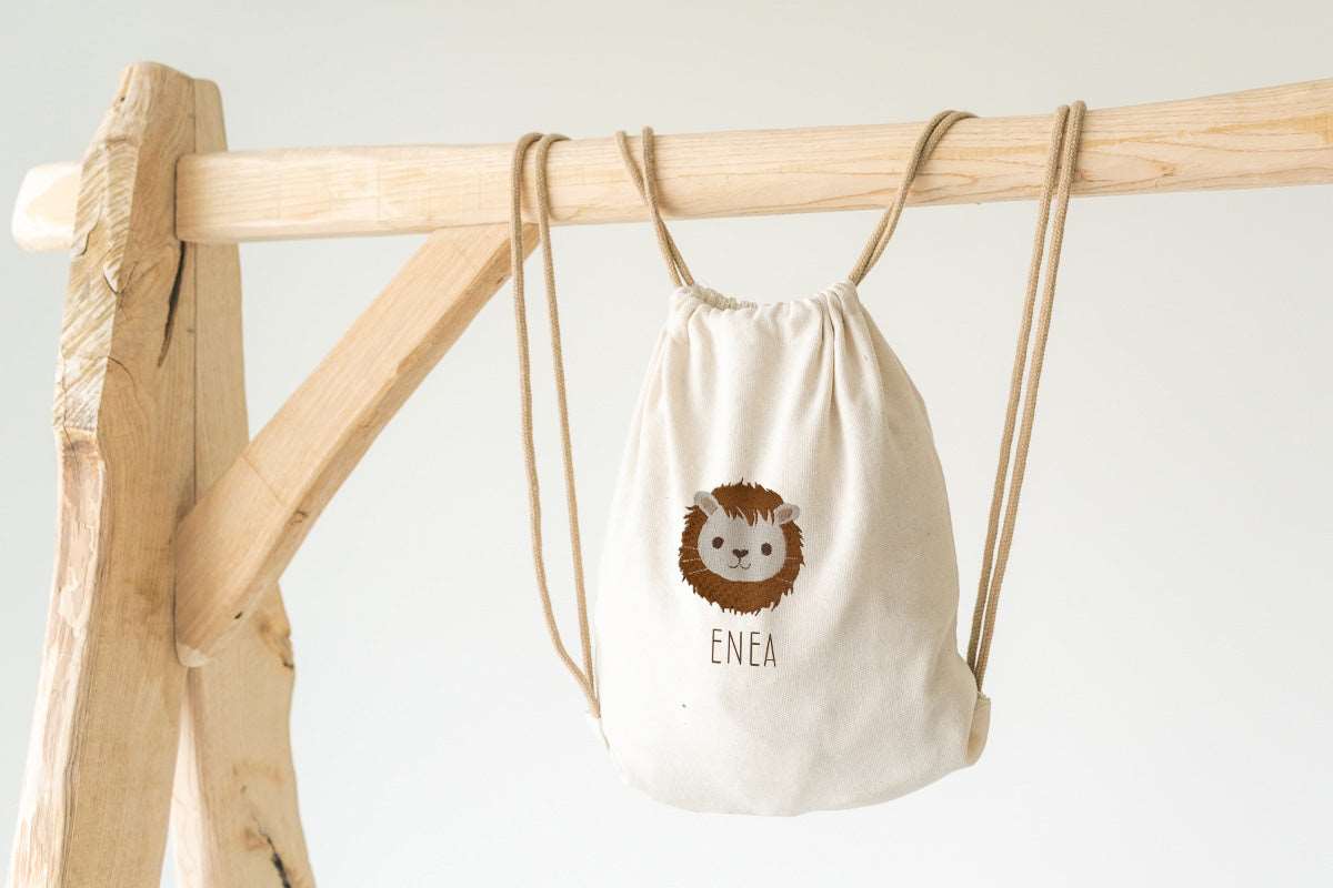 Sacca in tessuto riciclato con coulisse. E’ personalizzabile con i nostri ricami e il nome del bambino. Questa pratica sacca รจ perfetta per i bambini per le sue dimensioni (30x36cm). Ideale per belle stagioni, per le vacanze, l’asilo o le gite in famiglie.