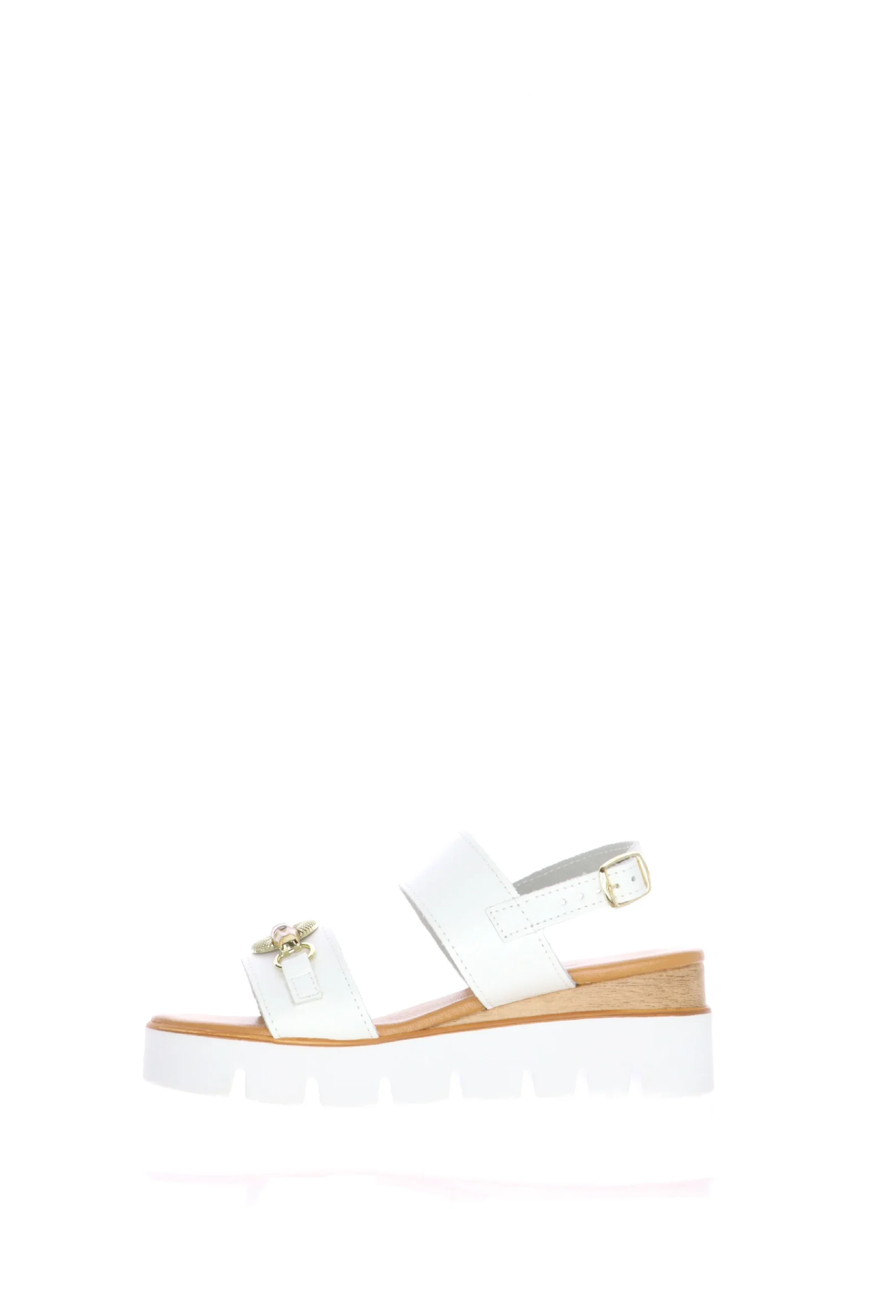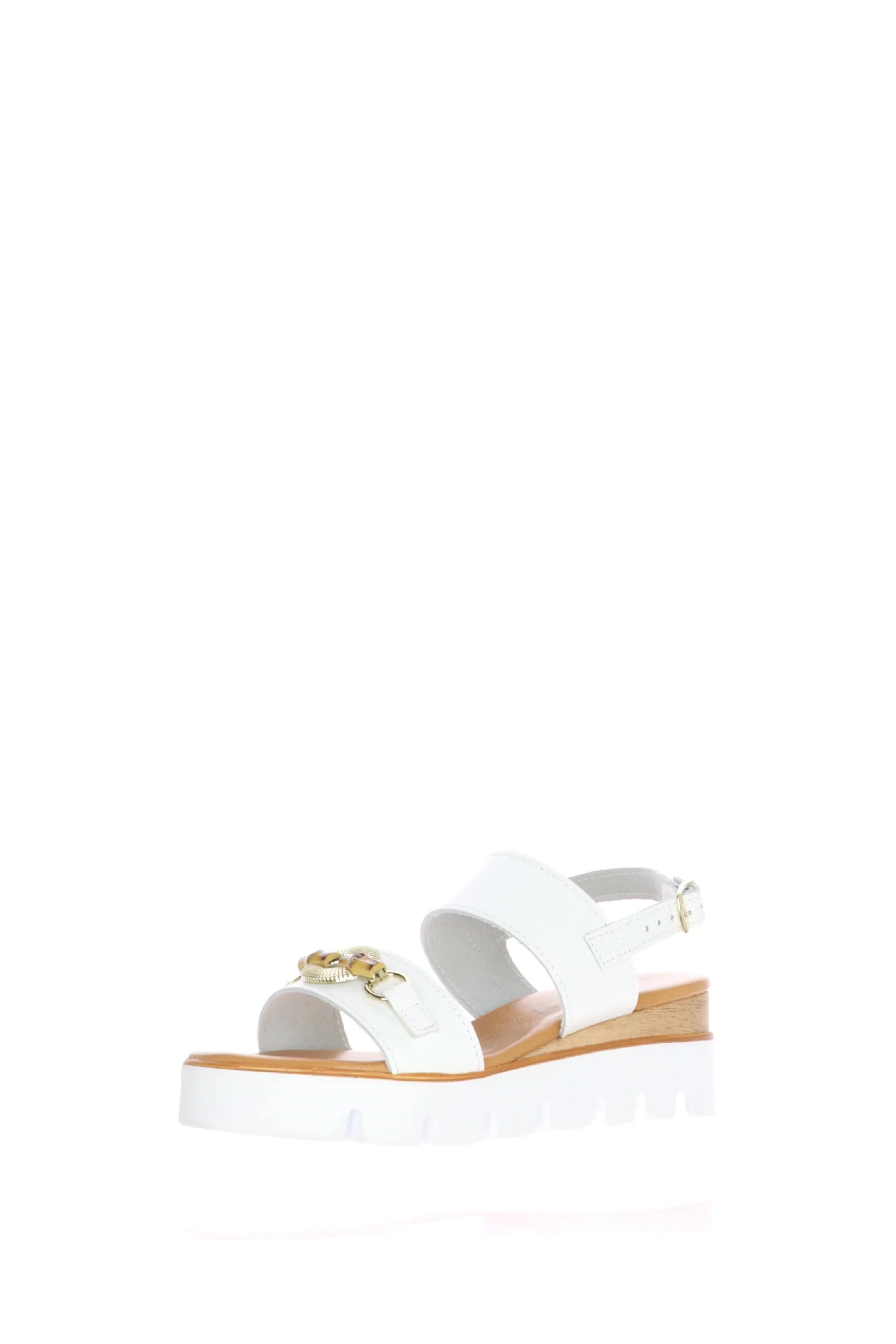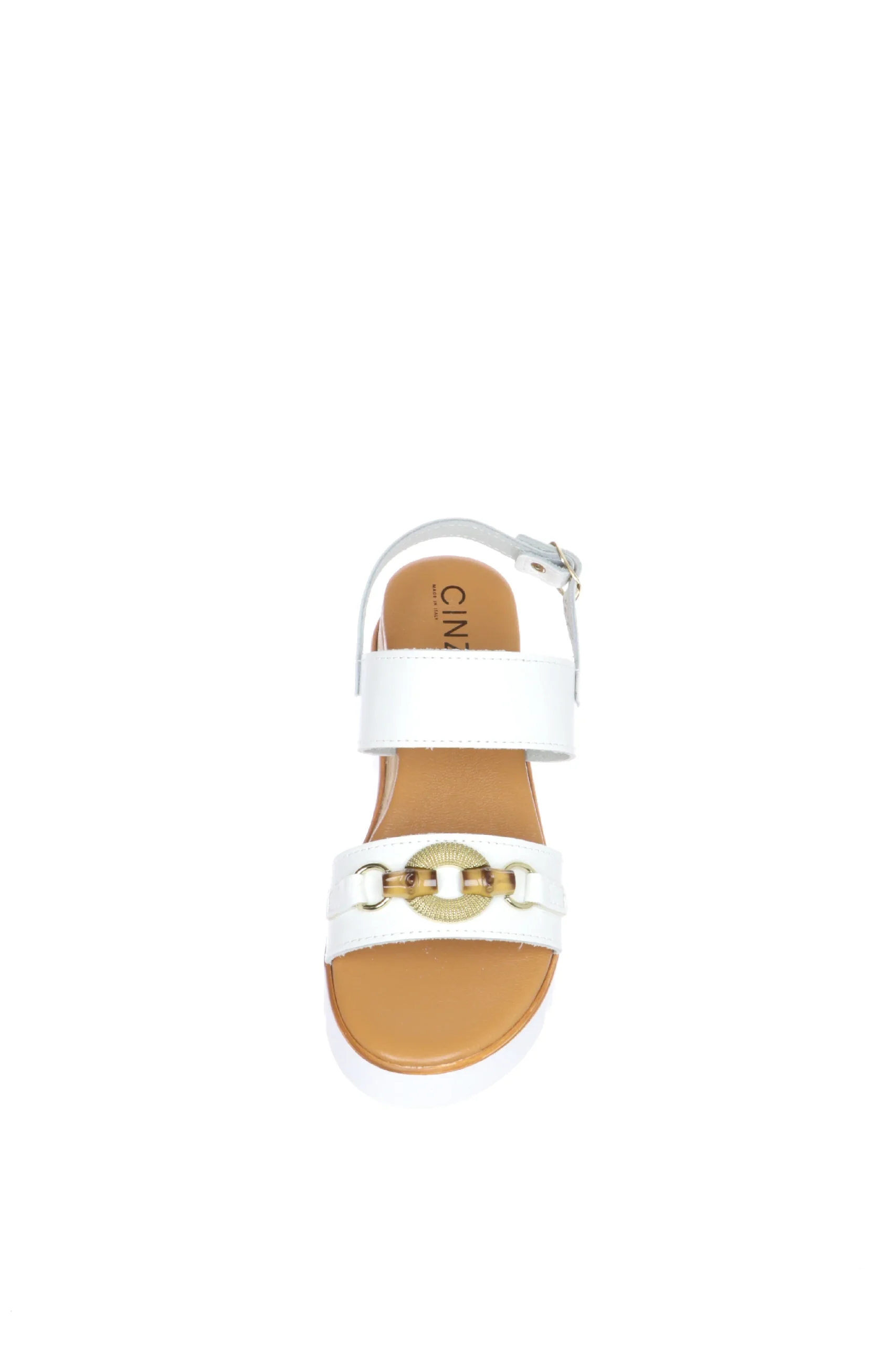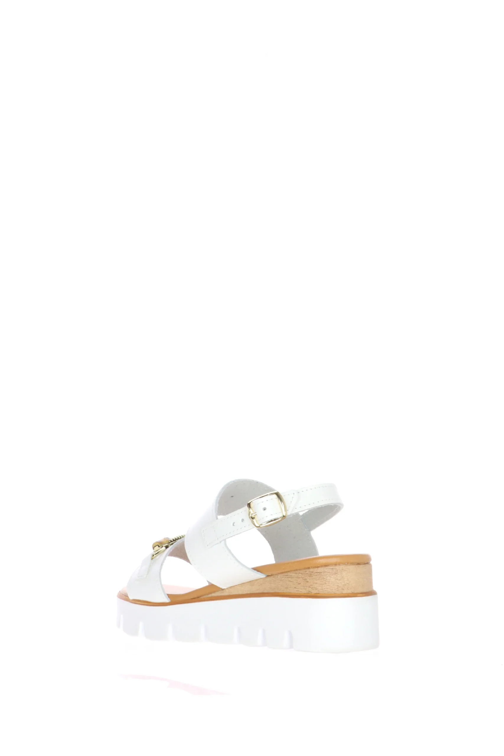 Sandalo a due fasce in morbida pelle nera o biancia. Accessorio catena dorata sulla prima fascia.Morbida e comoda, abbraccia la piantae l’altezza della zeppa รจ media, ideale per tutti i giorni ed il tempo libero. Lazeppa รจ lavorata con effetto legno.Cinzia Soft, calzature da vivere! Made in Italy