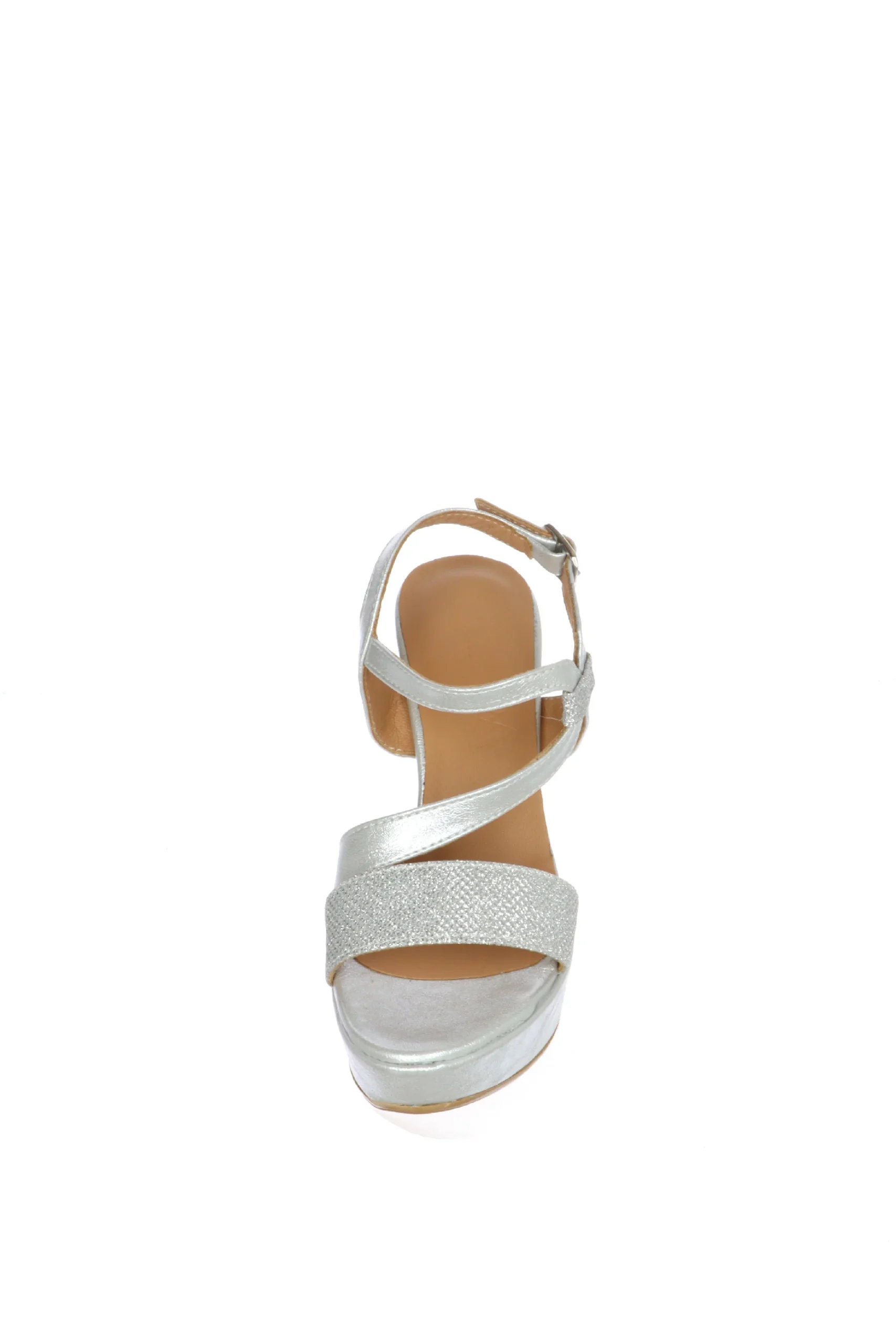 Sandalo elegante in pelle laminata dall’effetto leggermente glitterata e in tessuto glitter. Un sandalo comodo, che abbraccai bene la pianta, con incrocio decentrato sopra il dorso del piede. La pelle รจ morbidissima, il sottopiede รจ imbottito, il tacco doppio e stabile. Rendi unici i tuoi outfit! Sandra Calzature, qualitร artigianale made in Italy!