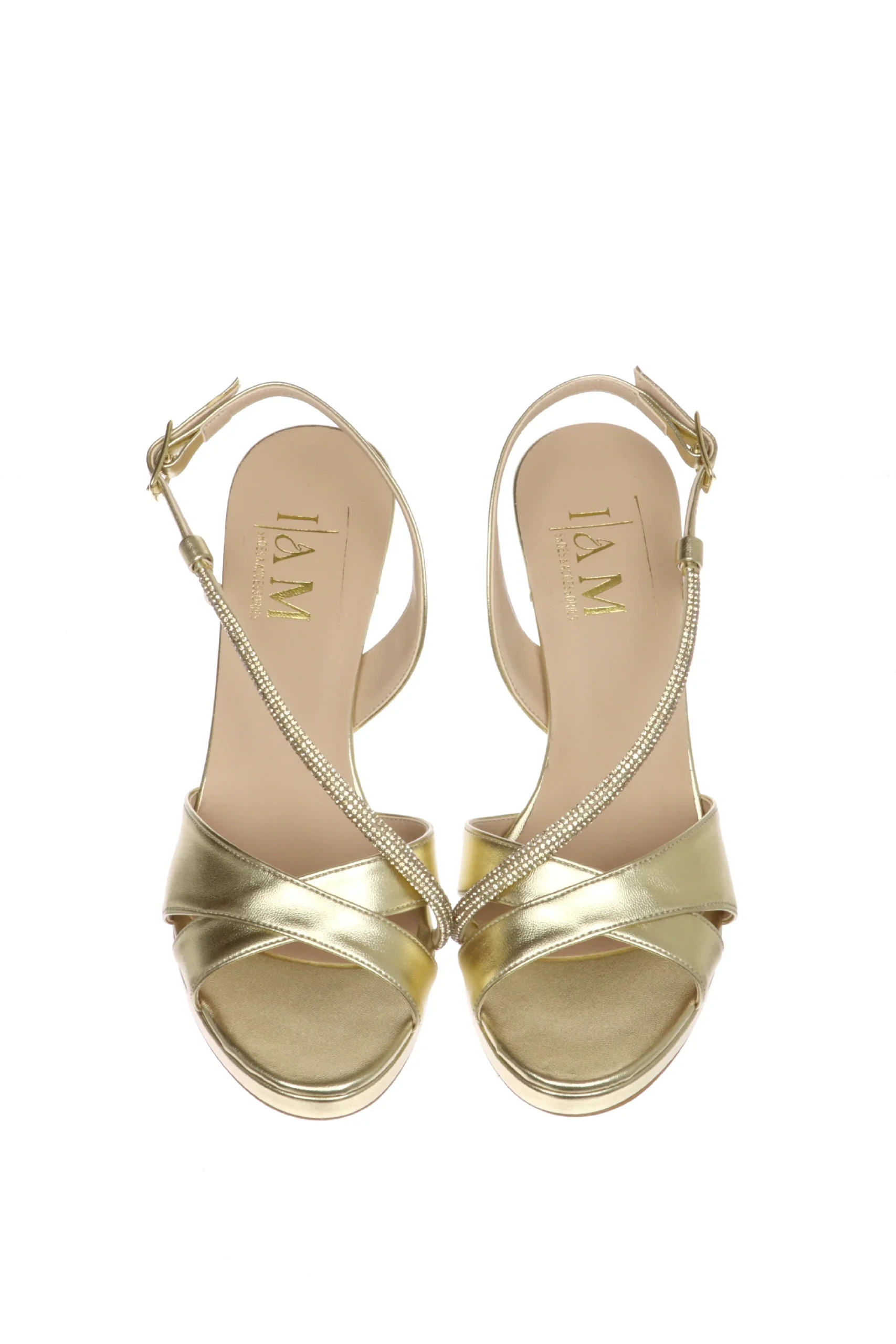 Sandalo gioiello platino con fascetta trasversale di strass. Le fasce incrociate, fisse, abbracciano bene la pianta, mentre il cinturino di strass trasversale ferma il piede e slancia la figura. Calzata comoda e avvolgente per un sandalo da indossare in momenti unici ed emozionanti! I AM è made in Italy