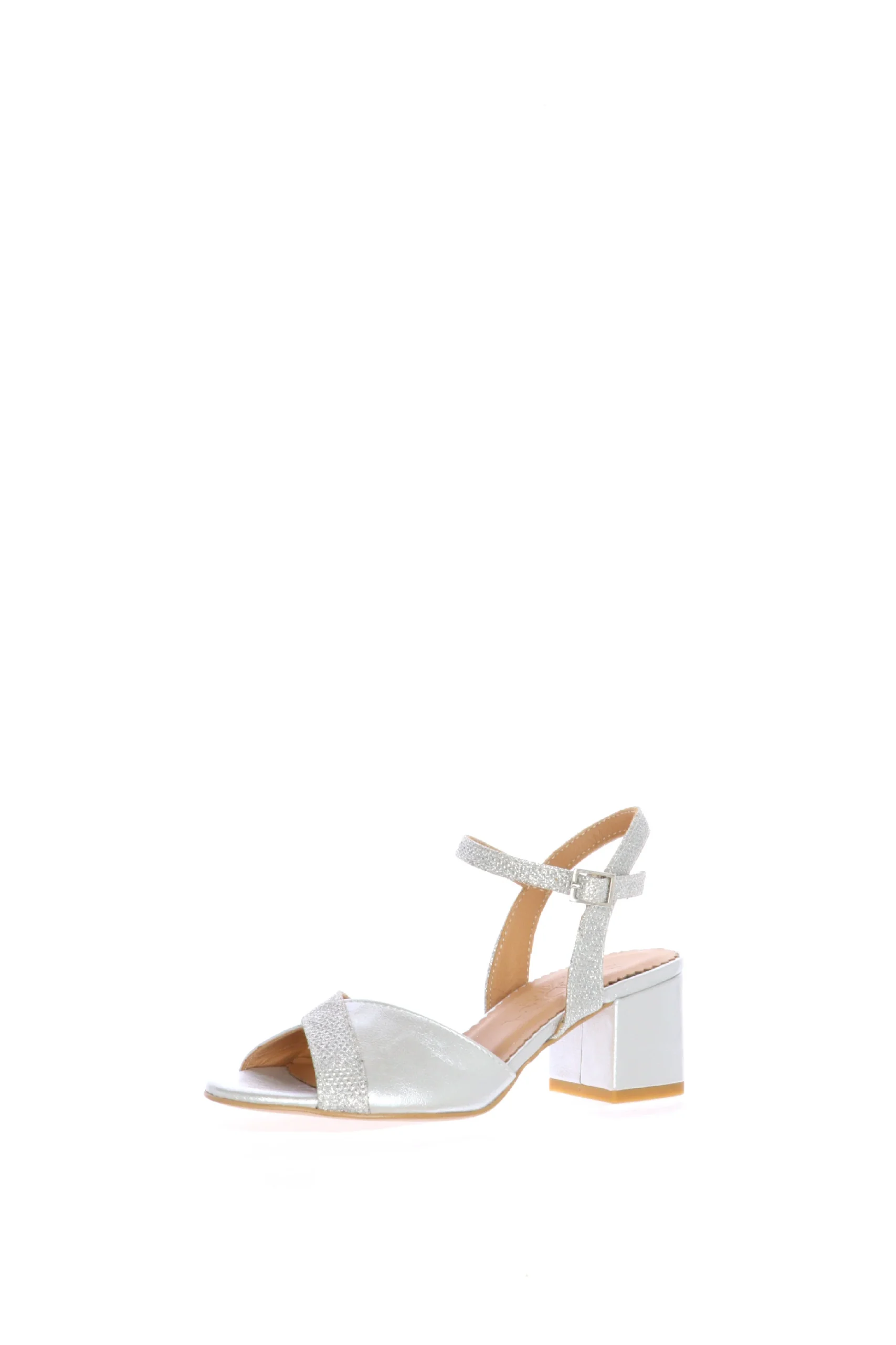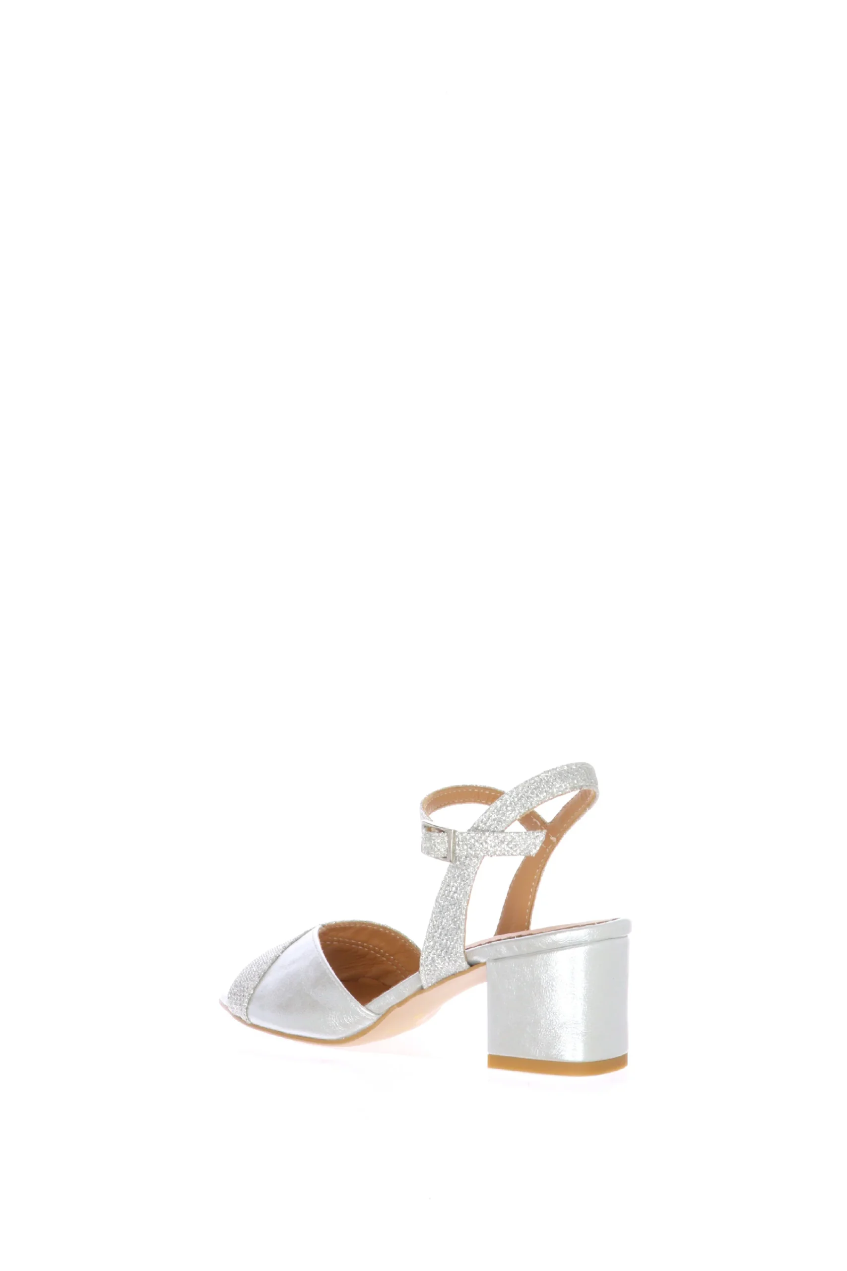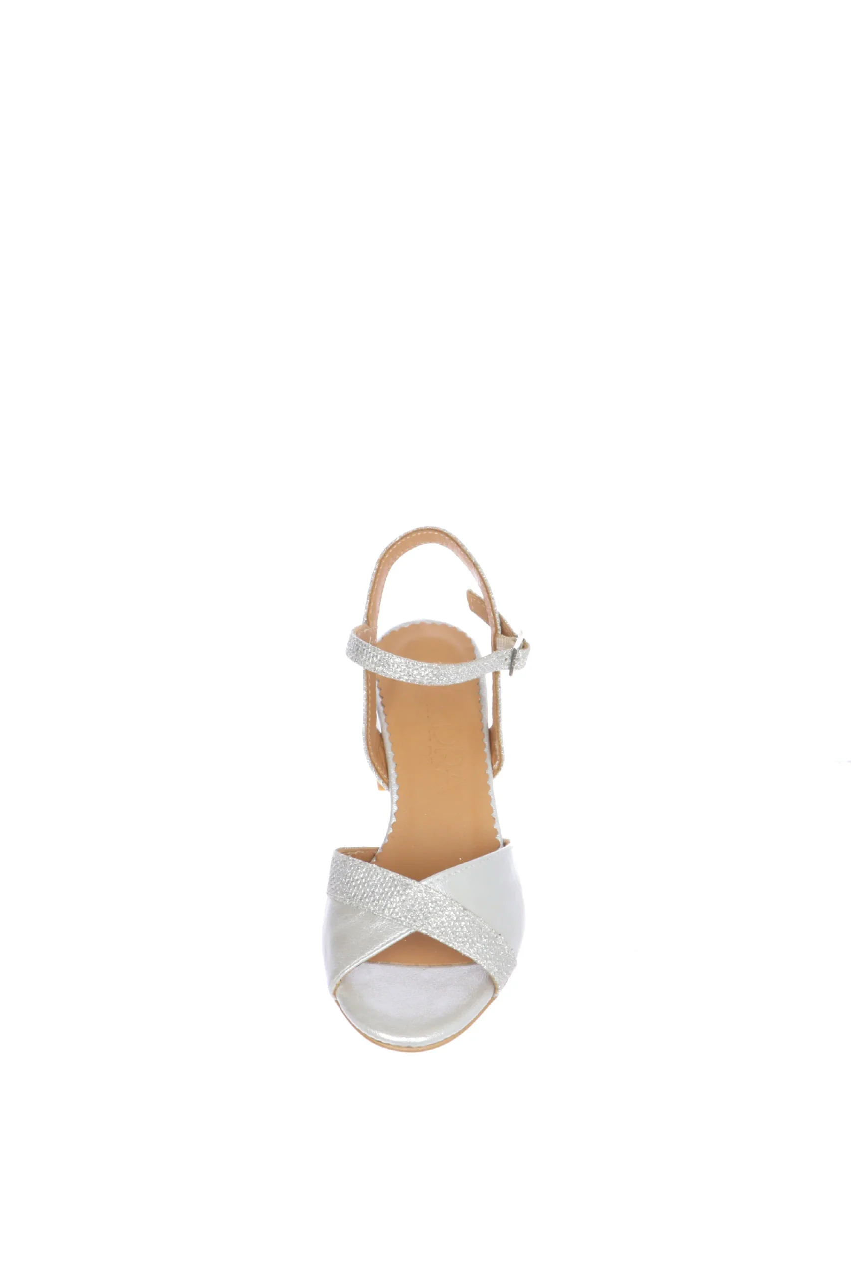 Sandalo in pelle laminata con dettagli in tessuto glitter. Disponibile nei colori argento e oro, dal n 32 al n 44 donna. Un sandalo comodo, che abbraccia bene la pianta del piede, ideale per eventi! Sandra Calzature, qualitร artigianale made in Italy!