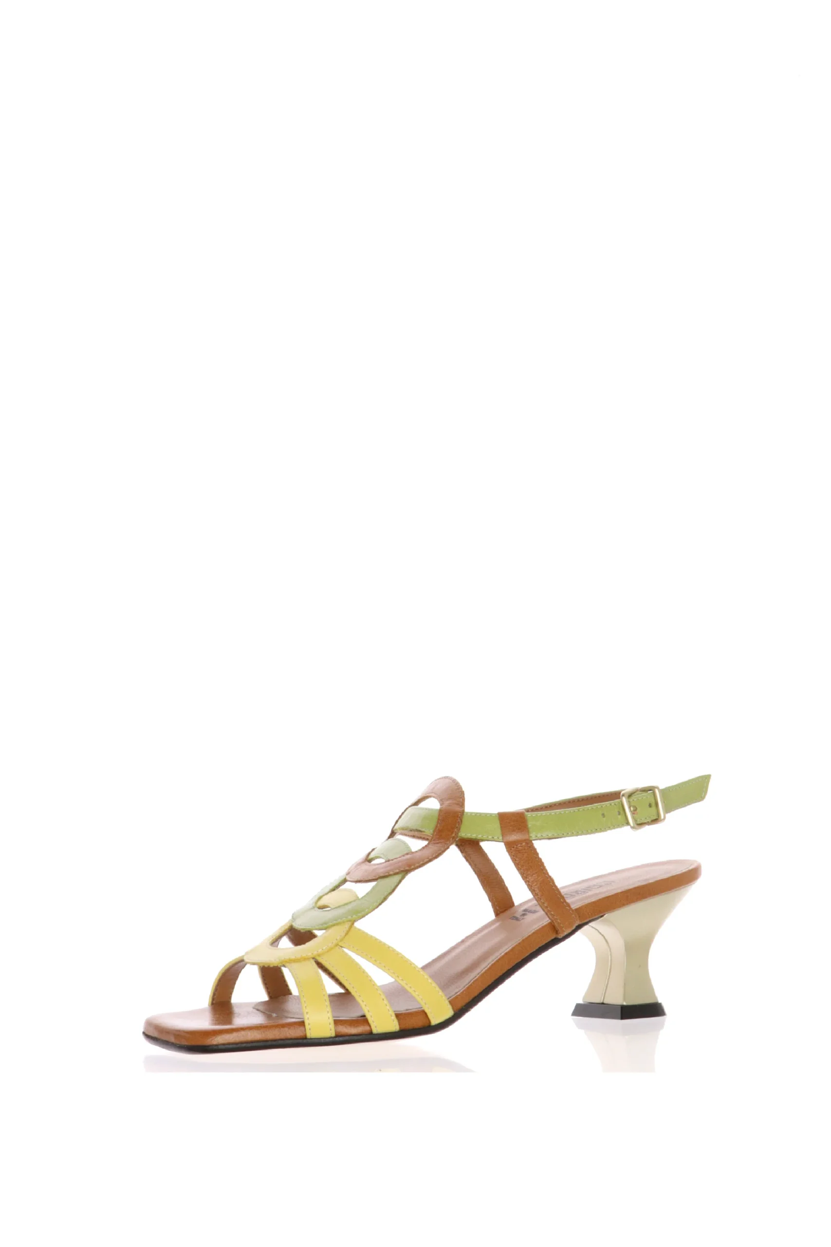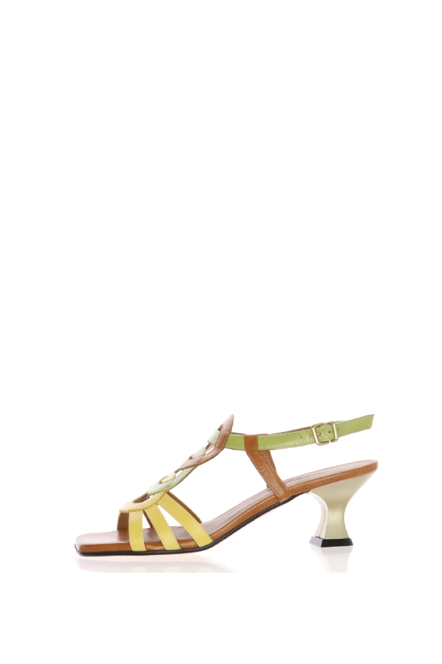 Sandalo in pelle tre colore, giallo verde e cuoio. Particolare nei colori e nella forma, questo sandalo รจ molto comodo e abbraccia bene il piede. Realizzato artigianalmente, in Italia, con pellami di prima scelta. Versatile e comodo, disponibile dal n 33 al n 42! L’airone by Legazzelle