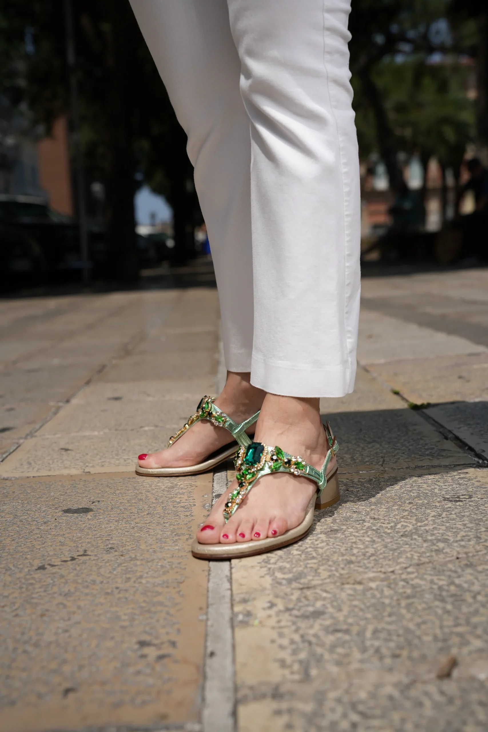 Arricchisci il tuo guardaroba con i sandali Soffice Sogno! Perfetti per la stagione estiva, questi sandali sono realizzati in pelle laminata verde con strass sulle tonalitร del verde o del cipria di alta qualitร , garantendo un look elegante e sofisticato. Il design presenta un tacco largo per una maggiore stabilitร e comfort, rendendoli ideali per essere indossati tutto il giorno. La tomaia รจ arricchita da dettagli gioiello dorati e cristalli scintillanti, aggiungendo un tocco di lusso e femminilitร . La chiusura con fibbia regolabile assicura una calzata perfetta, mentre la soletta imbottita offre un comfort ottimale.Perfetti per occasioni speciali o per donare un tocco di eleganza ai tuoi outfit quotidiani, i sandali Soffice Sogno sono un must-have per ogni donna alla moda.