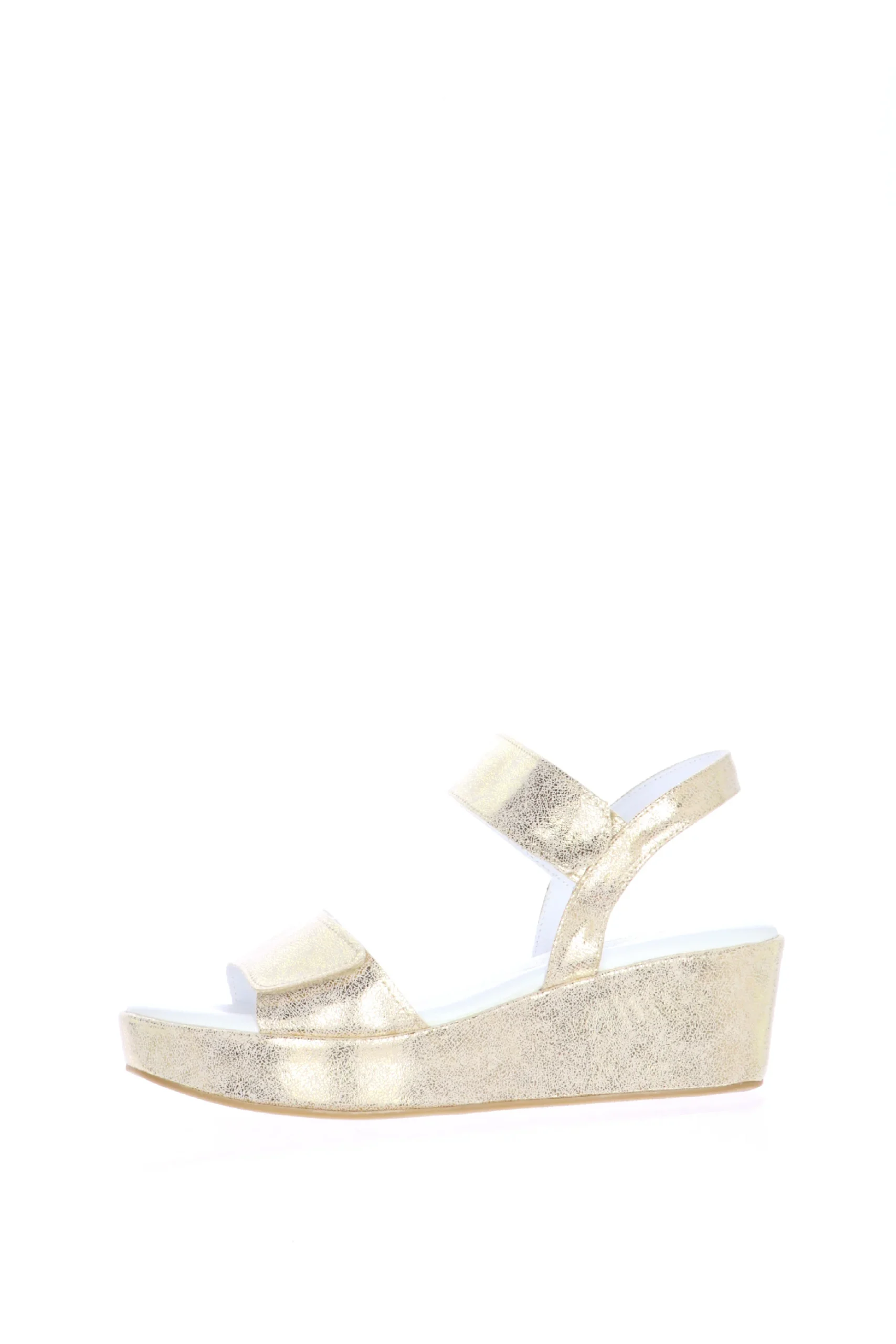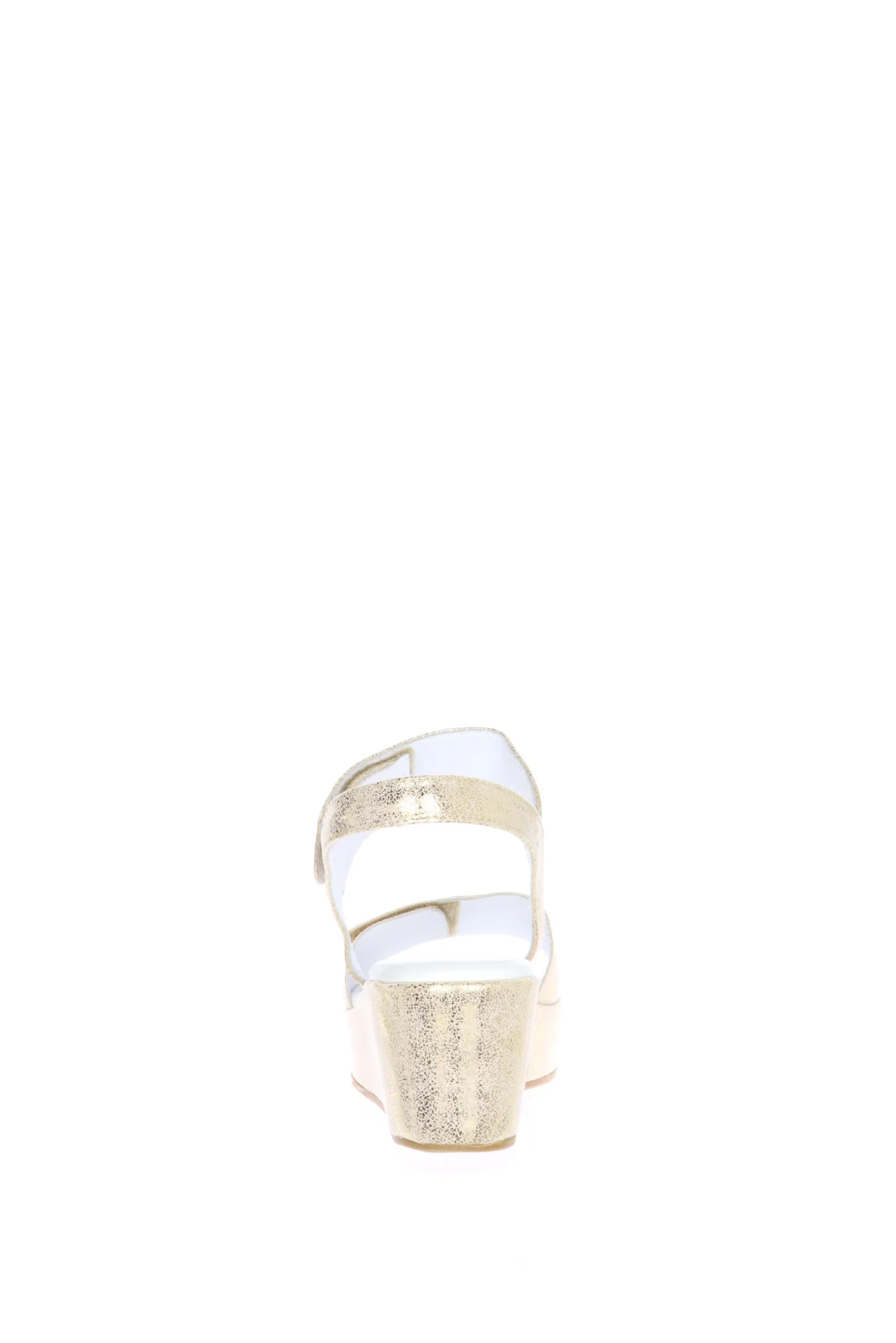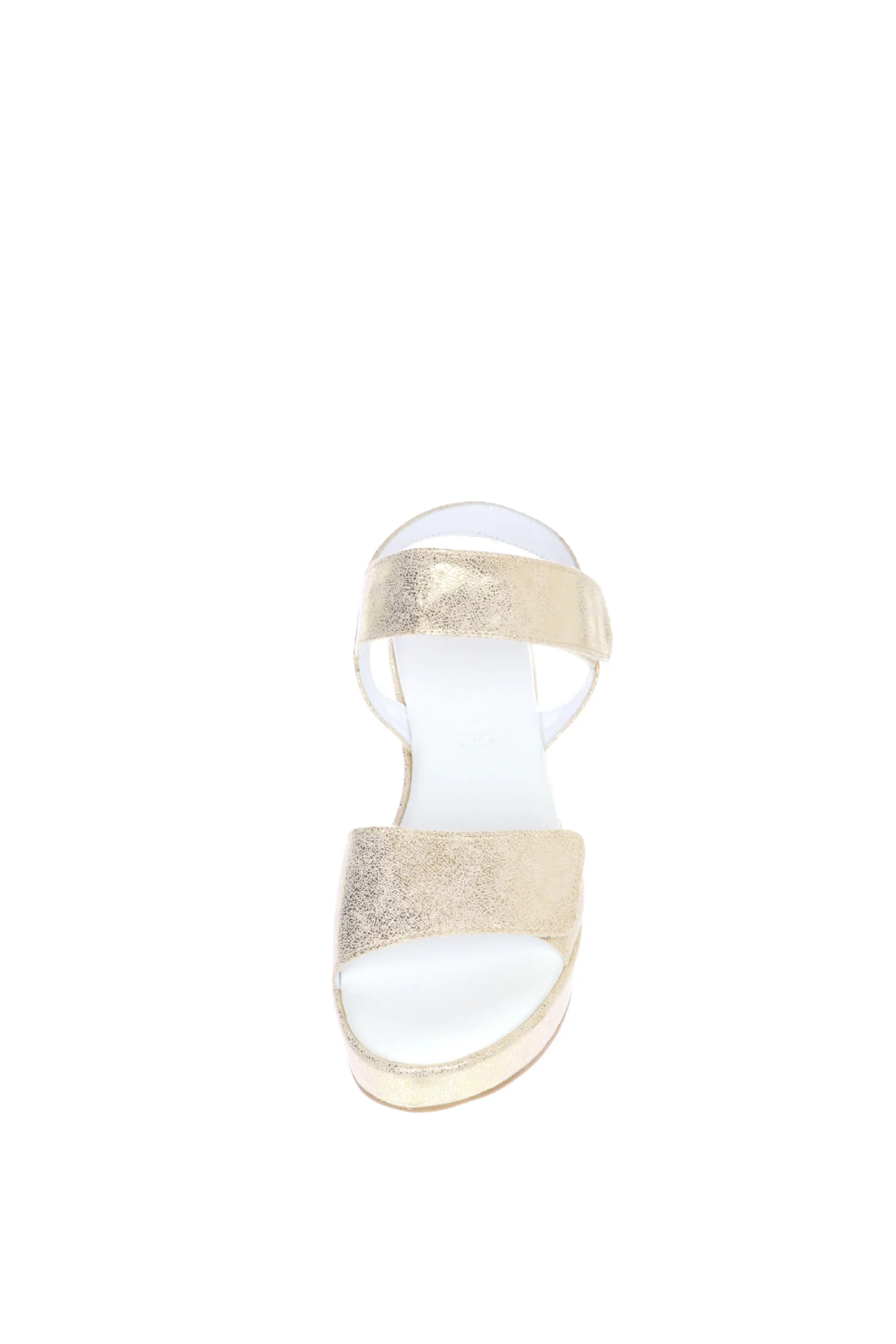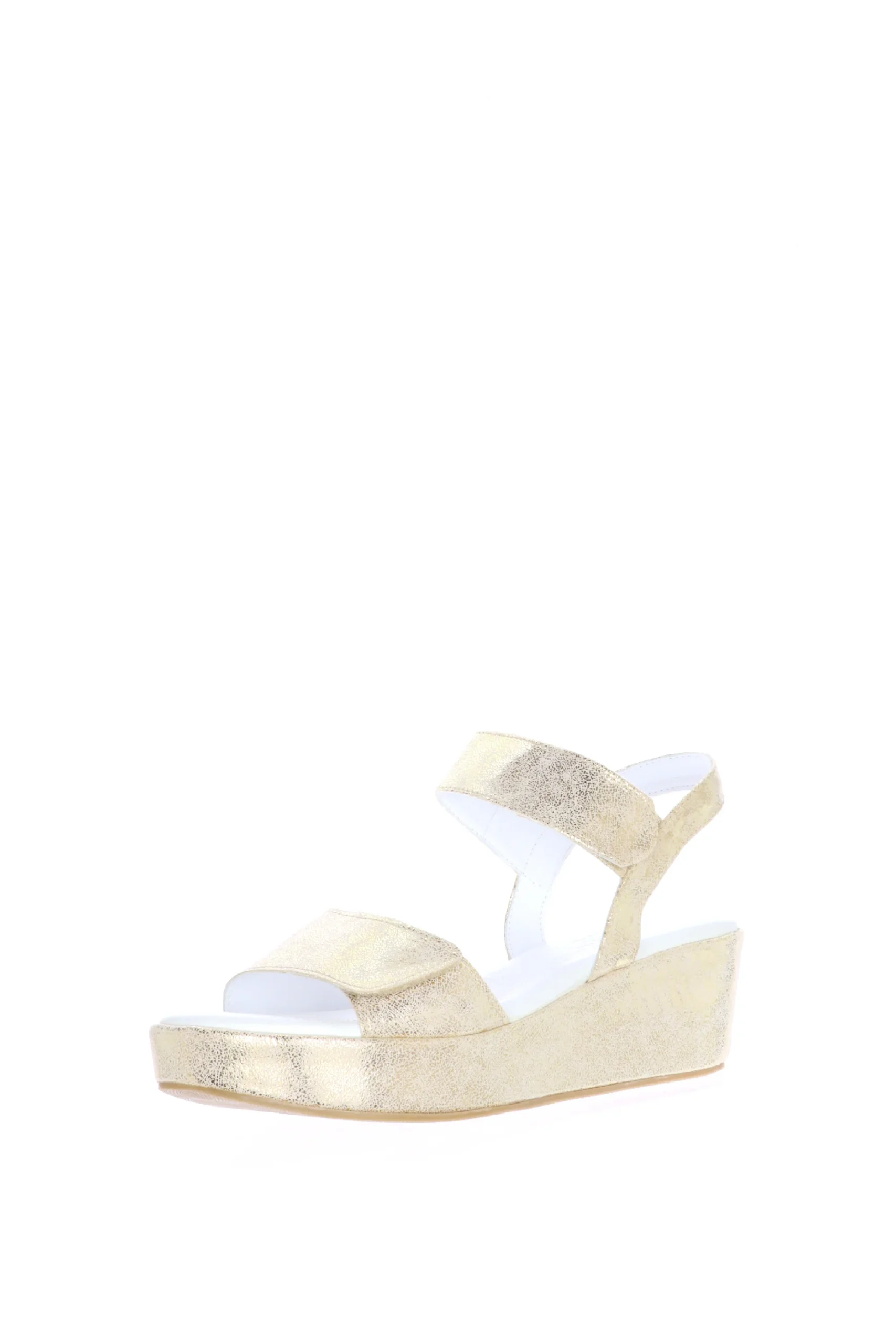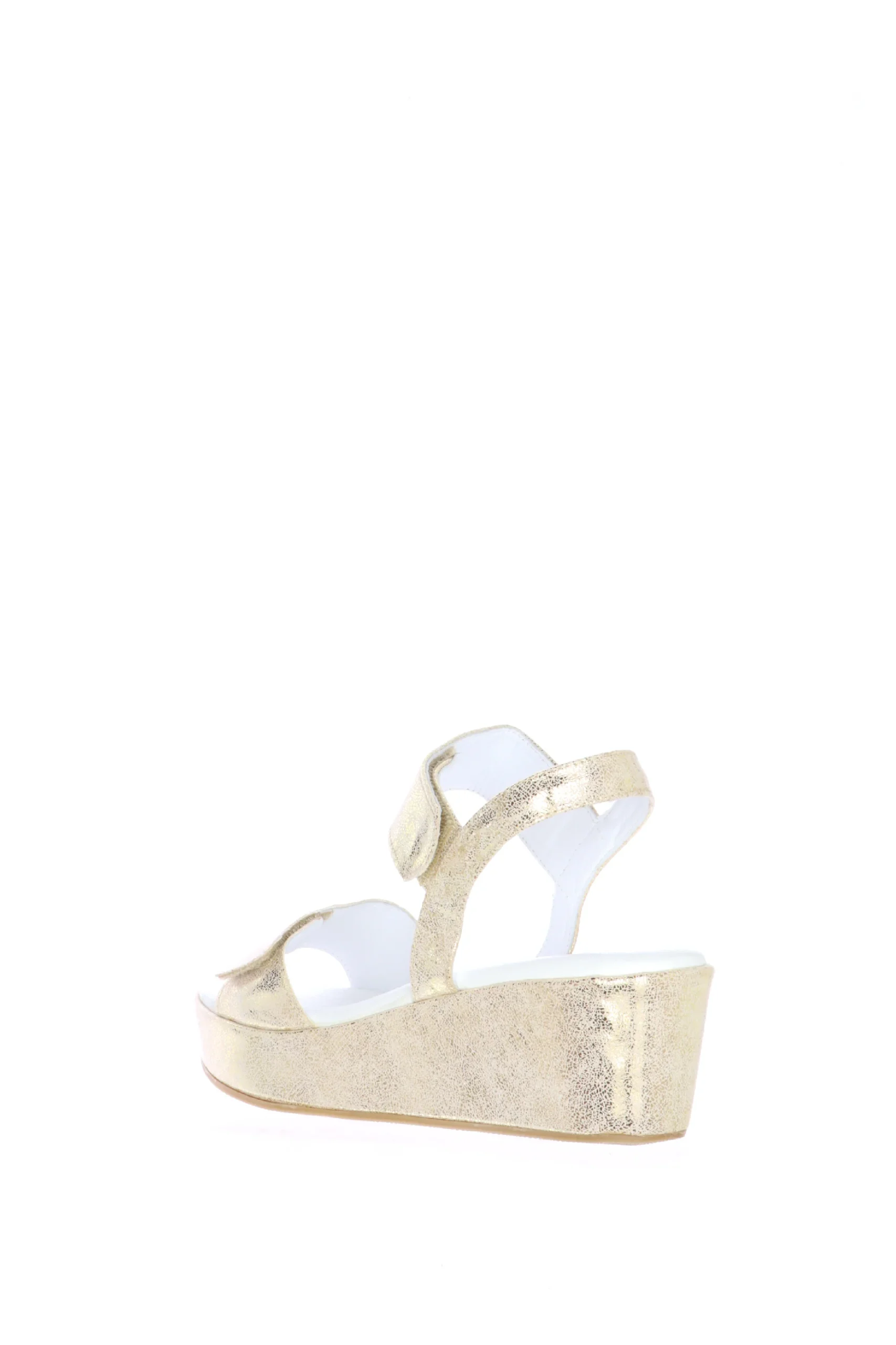 Sandalo regolabile in morbido camoscio platino. Una stampa luminosa per un modello ideale per tutti i giorni, con sottopiede morbidissimo in pelle e zeppa media. Linea artigianale made in Italy Sandra Calzature , disponibile fino al n 45.