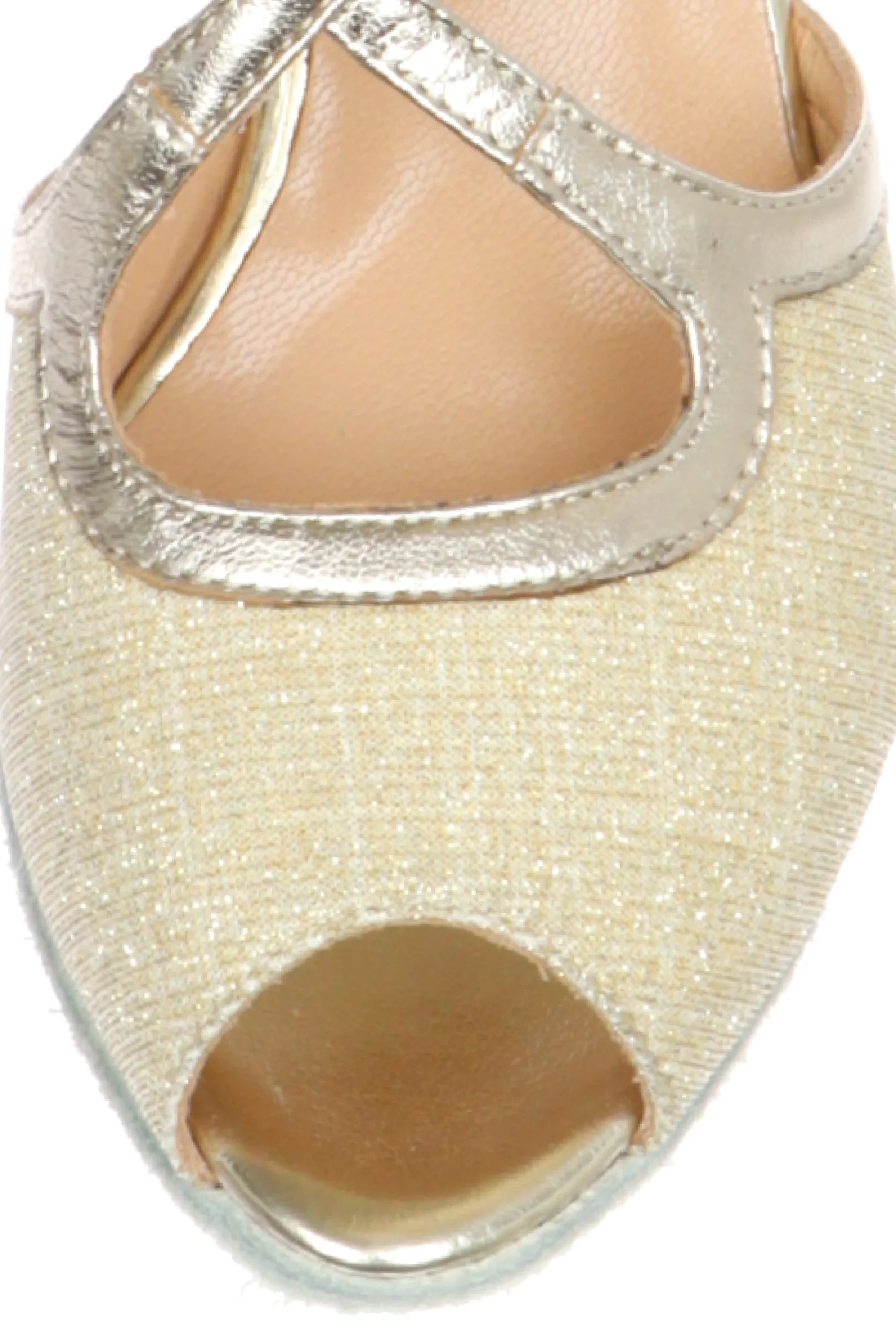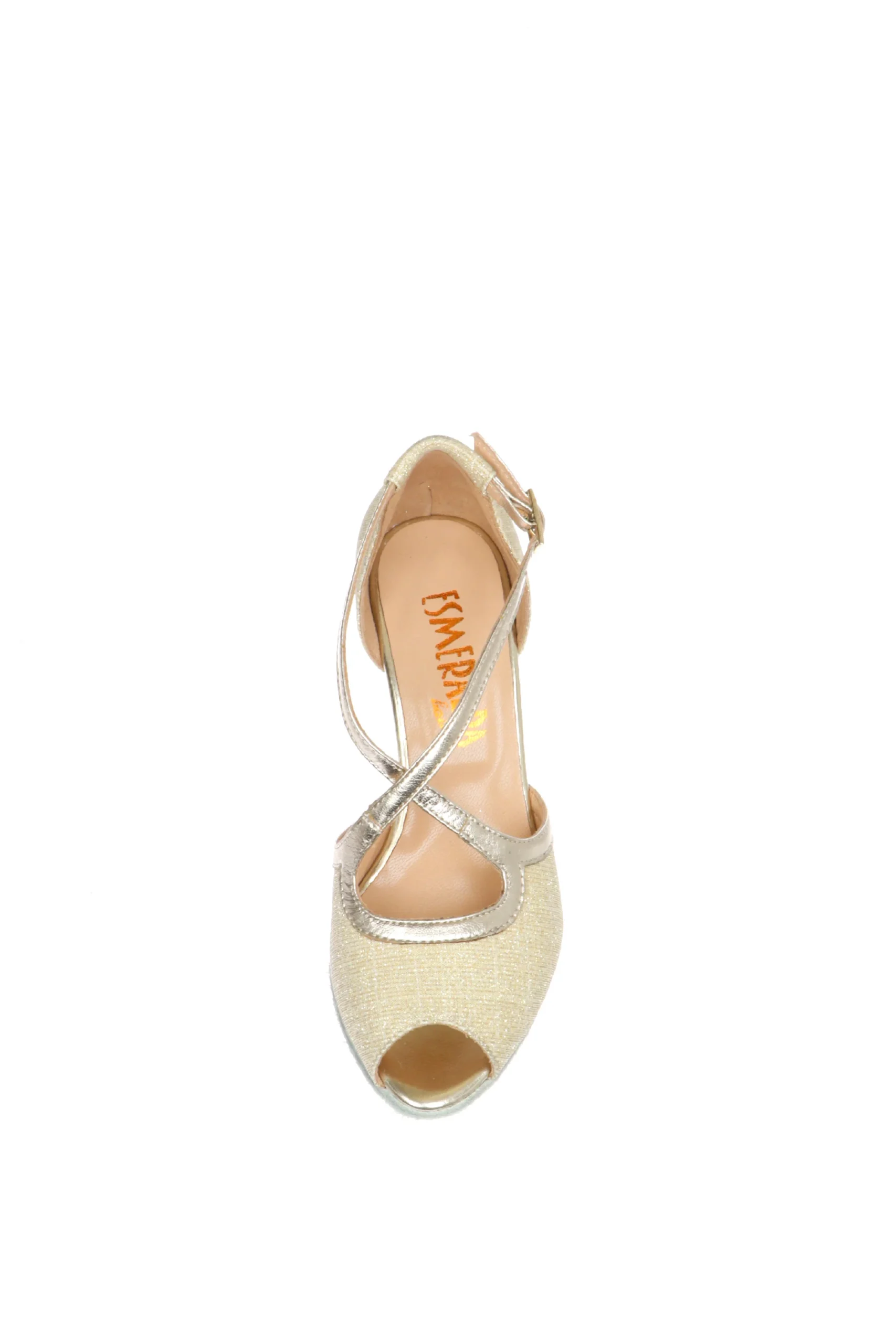 Scarpa da ballo chiusa al tallone in tessuto glitter platinocon icrocio sul dorso del piede Esmeralda. La qualitร del made in Italy. Ballare sarร piรน comfortevole,grazie al sottopiede imbottito in vera pelle e alla morbidezza della tomaia. Materialiscelti nei minimi dettagli e attenzione nei dettagli, il vero made in Italy.