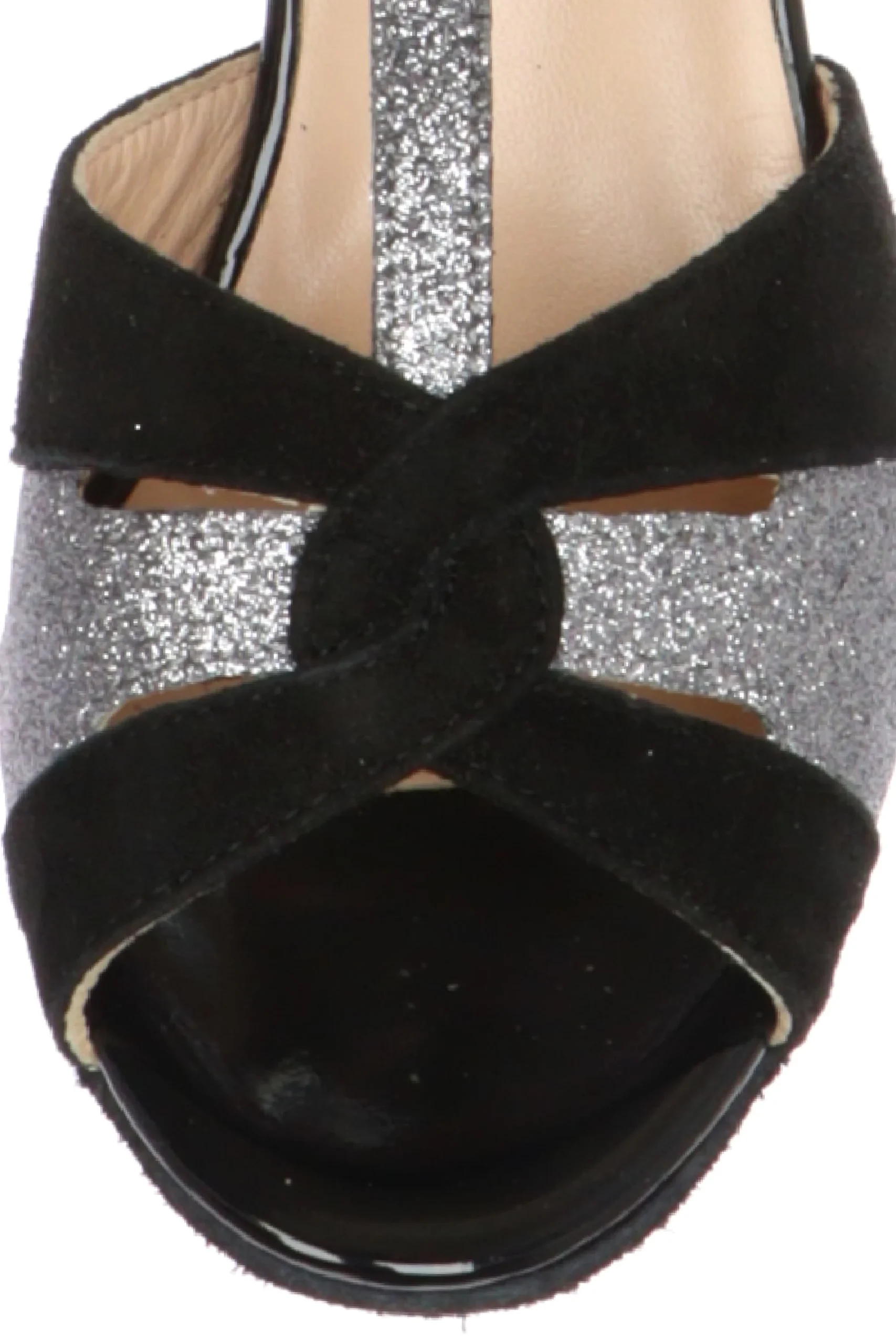 Scarpe da ballo in camoscio nero e glitter argento Esmeralda. La qualitร del made in Italy. Ballare sarร piรน comfortevole,grazie al sottopiede imbottito in vera pelle e alla morbidezza della tomaia. Materialiscelti nei minimi dettagli e attenzione nei dettagli, il vero made in Italy.