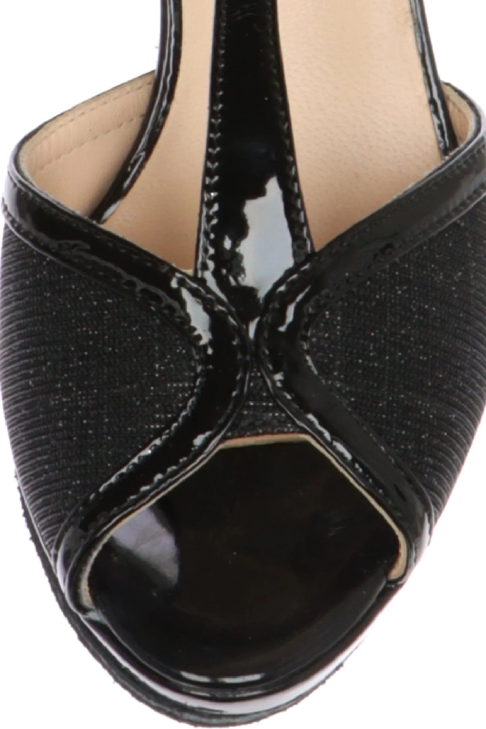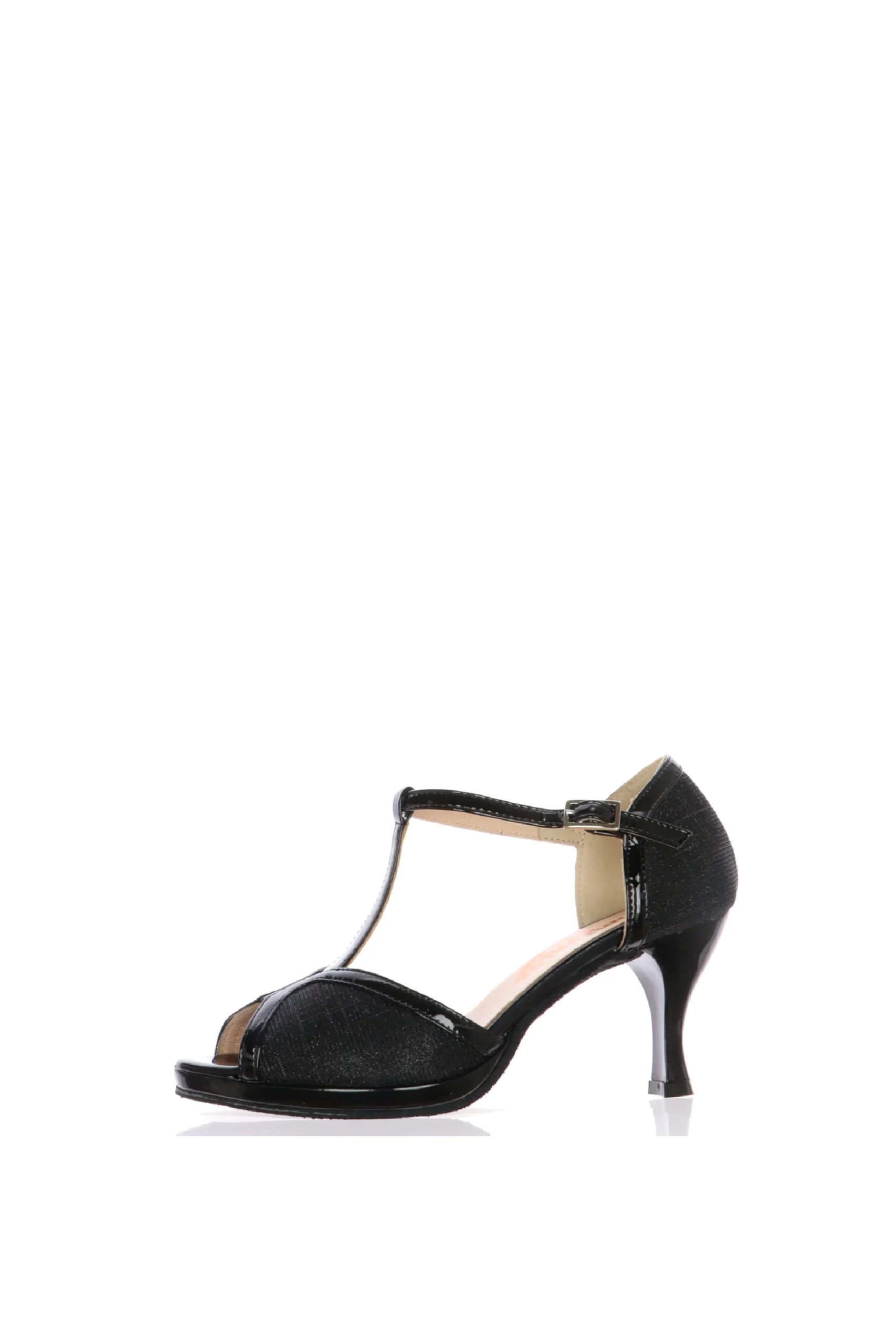 Scarpa da ballo chiusa al tallone in tessuto glitter nero e dettagli in vernice con cinturino a T Esmeralda. La qualitร  del made in Italy. Ballare sarร  piรน comfortevole,grazie al sottopiede imbottito in vera pelle e alla morbidezza della tomaia. Materialiscelti nei minimi dettagli e attenzione nei dettagli, il vero made in Italy.