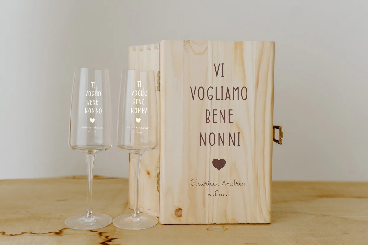 Prestigiosi flute da bollicine in vetro 100% alta qualità Made in Italy incisi con dedica per i Nonni, abbinati a una scatola in legno incisa come per i bicchieri. La dedica sarà al plurale per poi nel bicchiere essere personalizzata uno per la nonna e uno per il nonno.