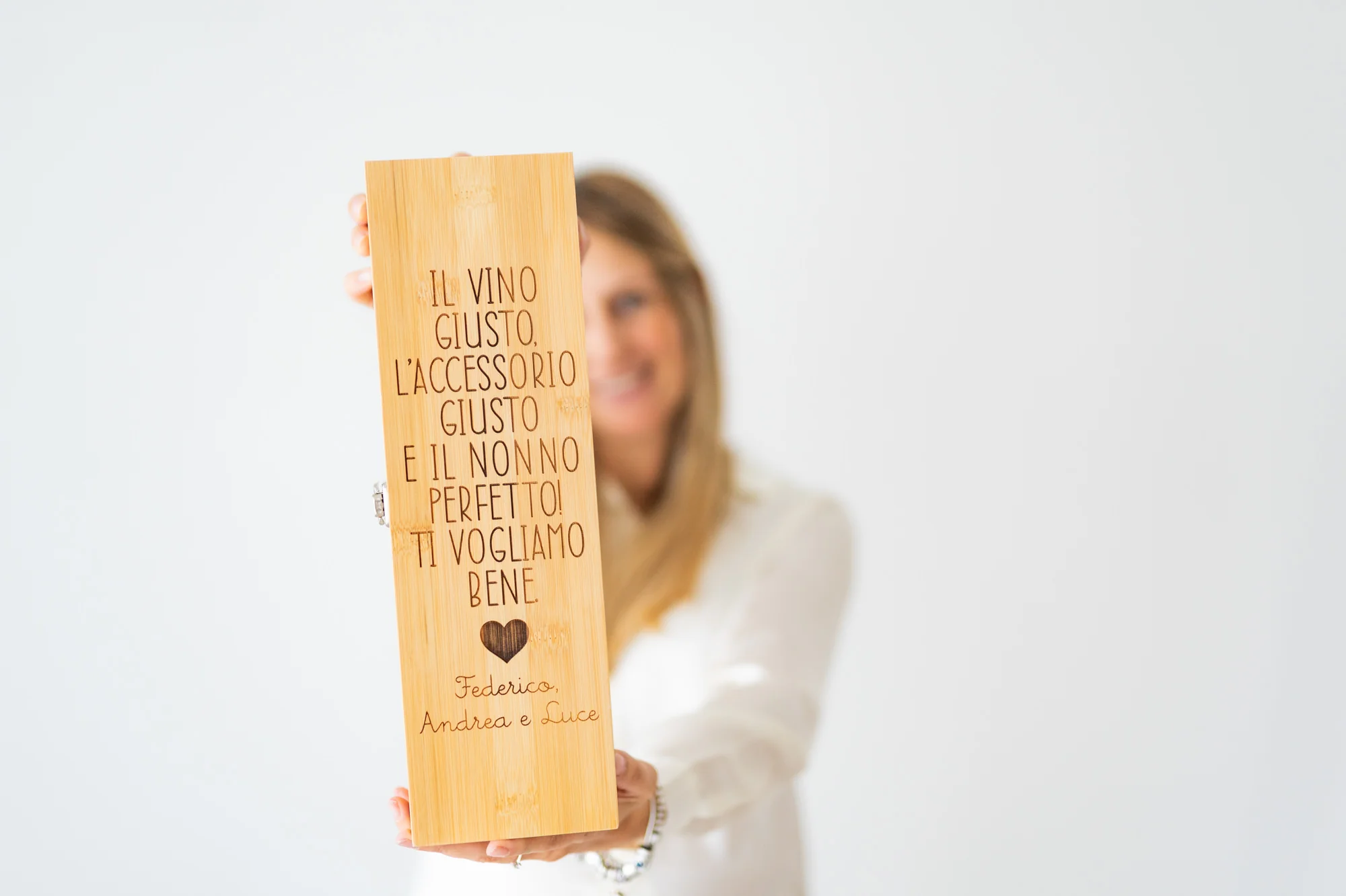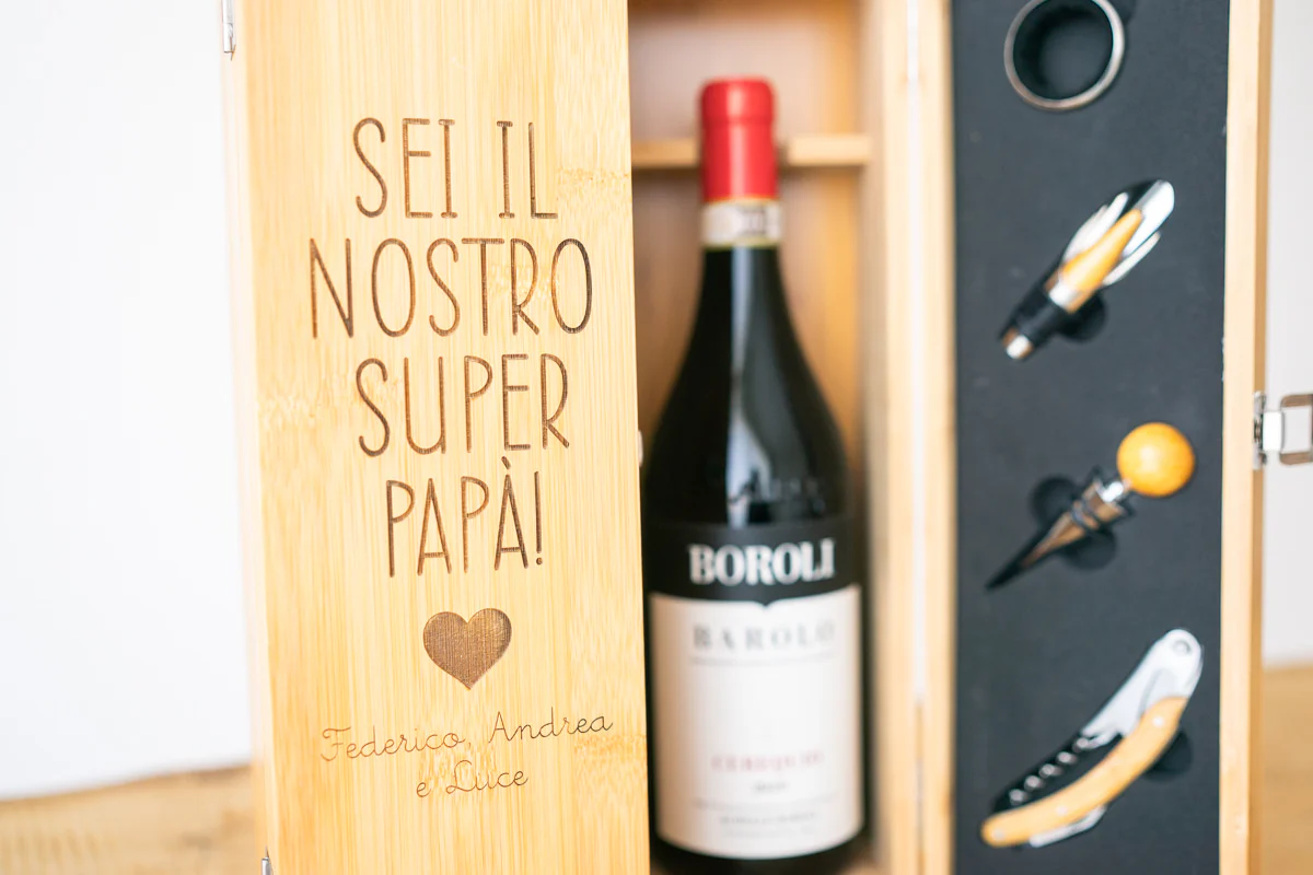 Aggiungi un tocco di eleganza al tuo regalo con questo raffinato cofanetto in legno, perfetto per una bottiglia di vino e i suoi accessori. Personalizzabile con una dedica incisa a laser, è l’idea regalo ideale per occasioni speciali come matrimoni, anniversari o compleanni. Un pensiero unico e sofisticato che renderà ogni momento ancora più memorabile. Questo set è composto da accessori in acciaio inossidabile, come un cavatappi con tagliacapsule, un dispenser, un tappo e un anello antigoccia. Questi elementi forniscono tutti gli strumenti necessari per aprire e gustare la bottiglia di vino con facilità . L’interno del cofanetto è imbottito per garantire la sicurezza e la stabilità della bottiglia durante il trasporto. Inoltre, il legno utilizzato per la sua produzione offre una protezione aggiuntiva contro gli urti e gli sbalzi di temperatura.