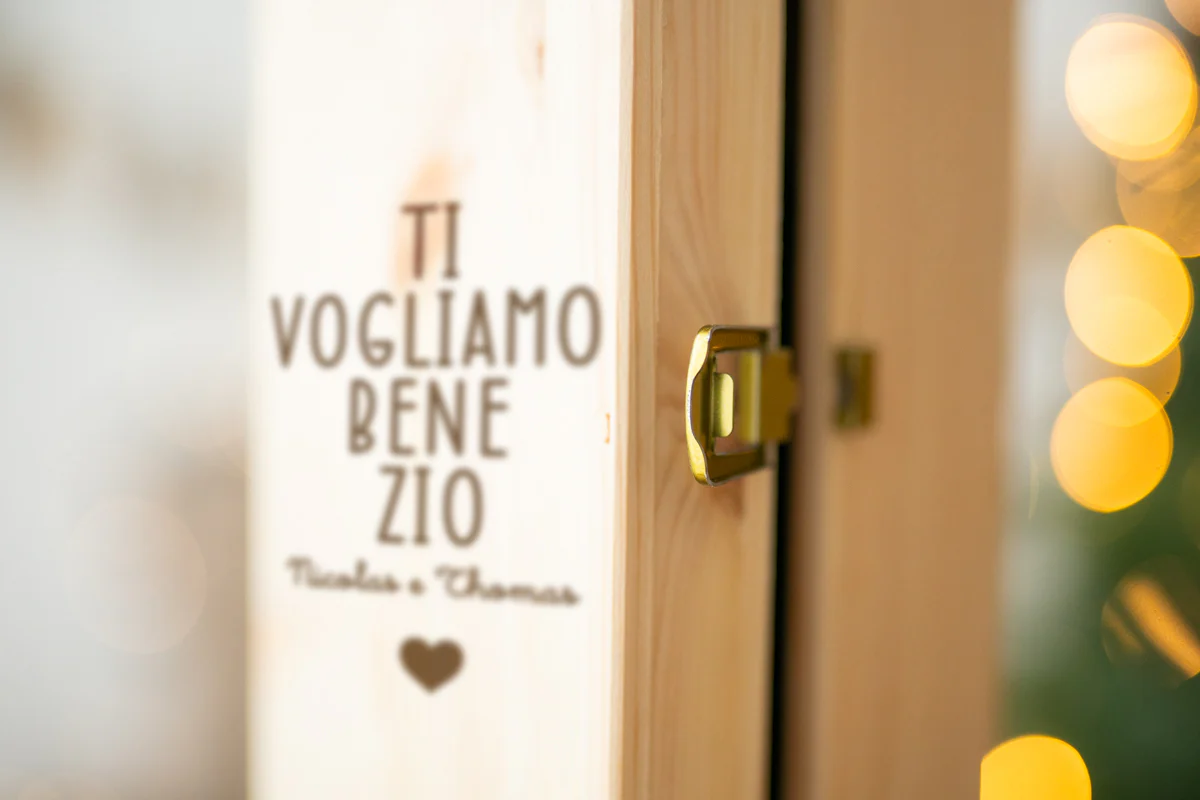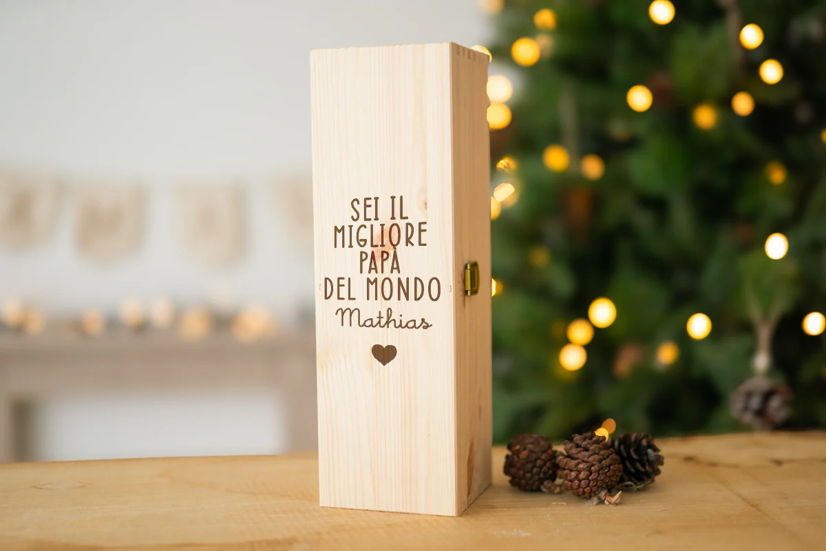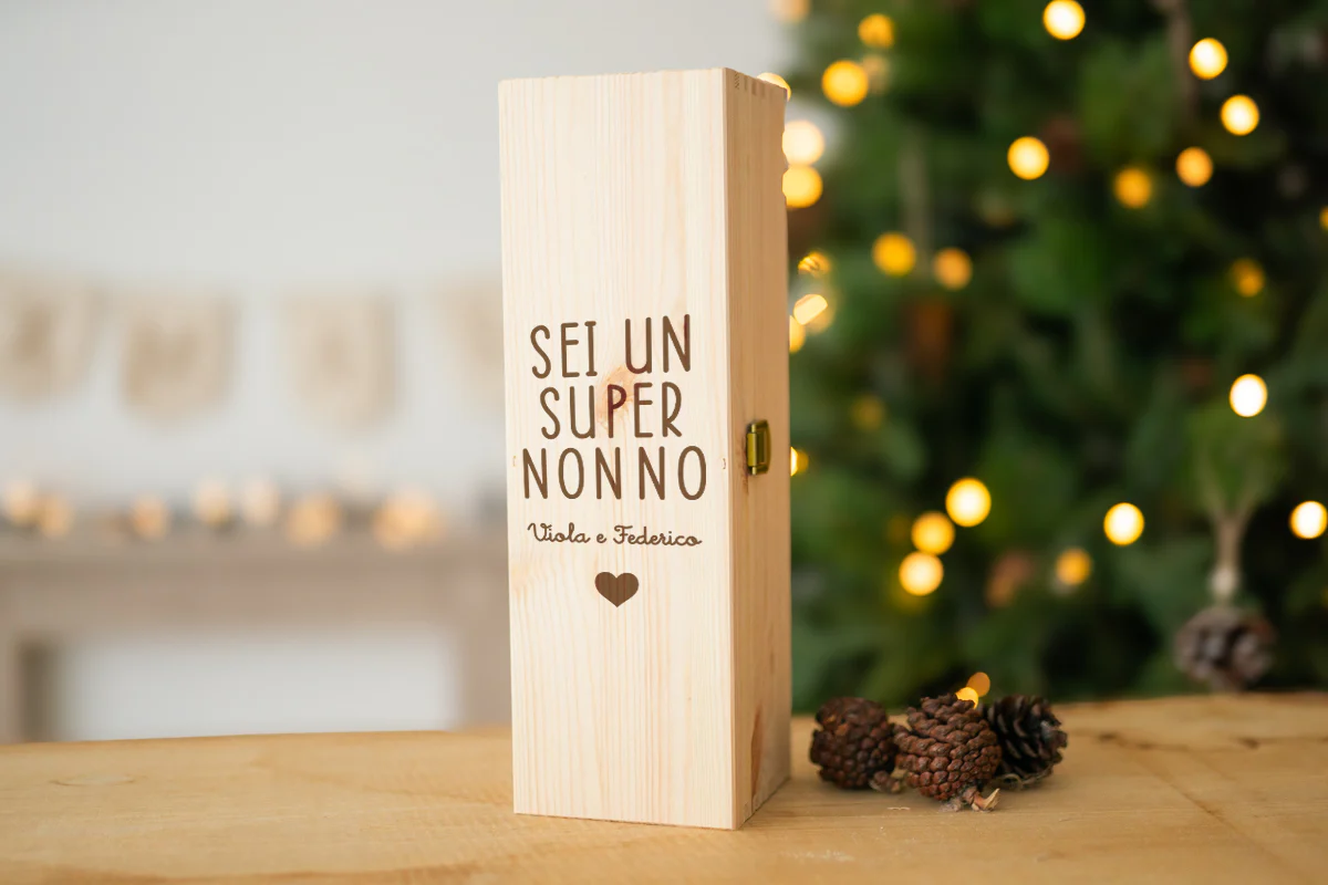 Scatola in legno per vino fermo 750ml con fermacollo in cartone, incisa a laser nel nostro laboratorio con dedica personalizzata per un’idea regalo speciale.