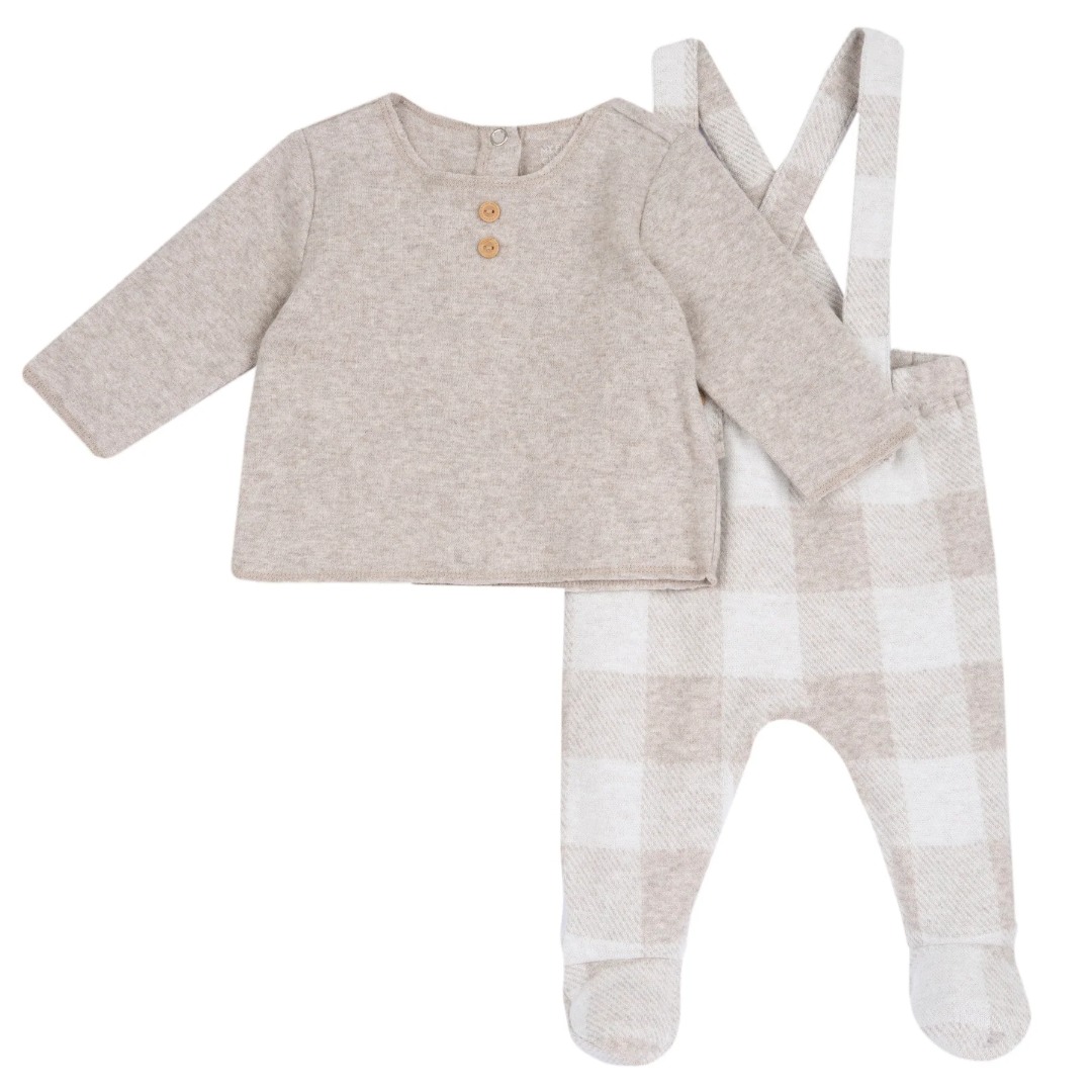 Completo caldo con maglietta e salopette, pantaloni caldi con fodera e bretelle. Dettaglio dei bottoni effetto legno.