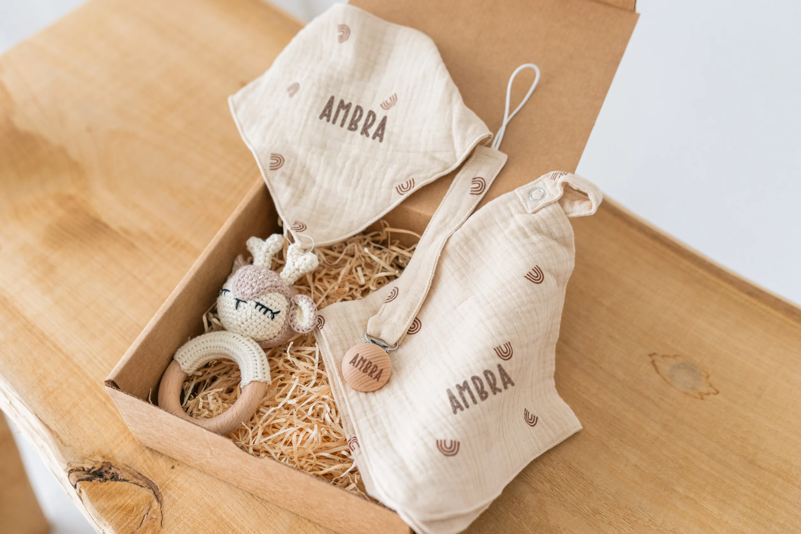 Bellisimo set di 4 articoli personalizzato a ricamo e con incisione. Idea regalo nascita originale e sempre apprezzata dalle mamme.
