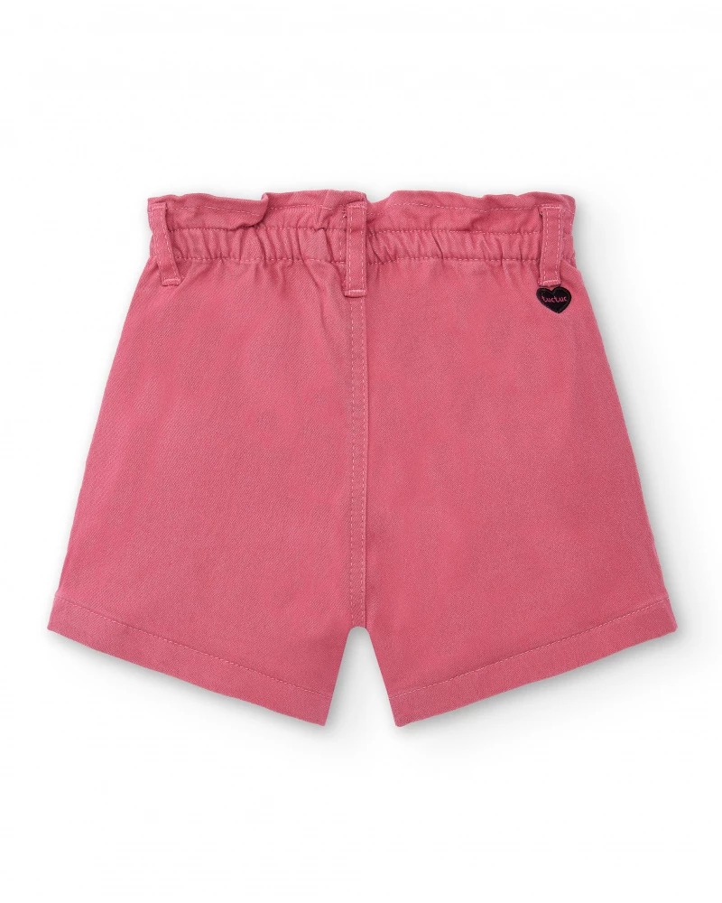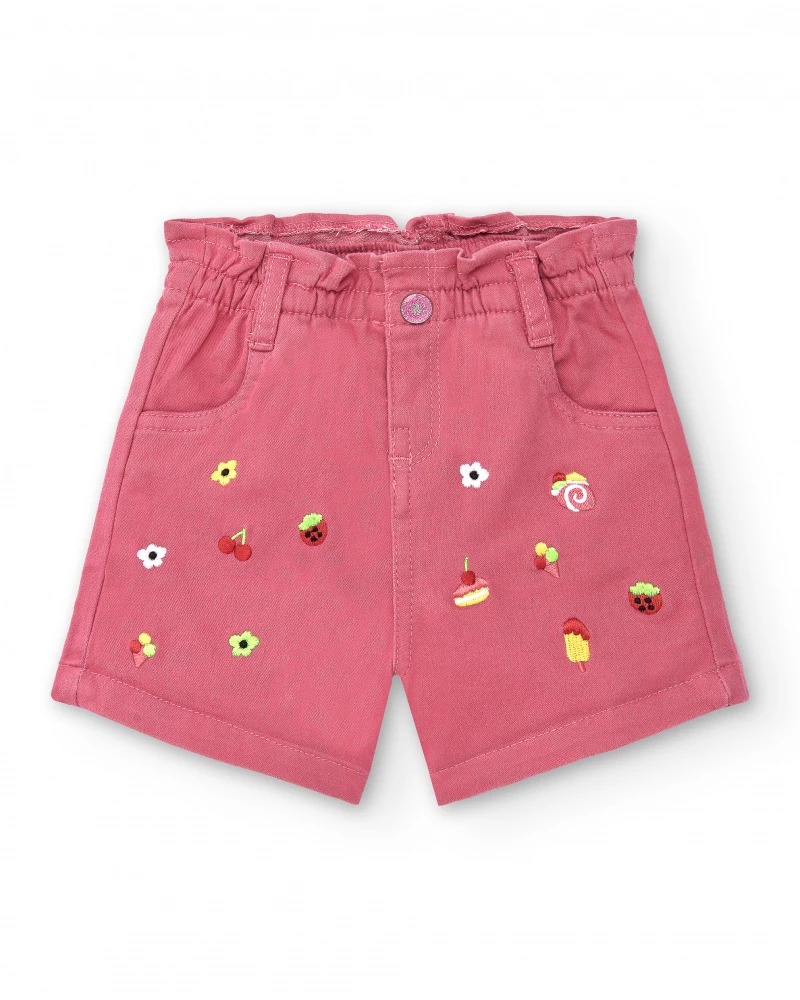 Shorts in denim per bambina di colore fuxia con tasche frontali e risvolto. Vita elasticizzata con bottone, passanti per cintura e piccoli ricami floreale sul davanti.