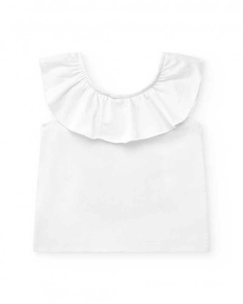 Maglietta per bambina di colore bianco con volant sulle spalle e stampa tropicale con dettagli colorati.