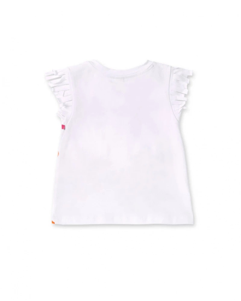 Maglietta per bambina a maniche corte bianca con stampa di palme di colore giallo, rosa, rosso e arancio. Dettaglio a frange sulle maniche.