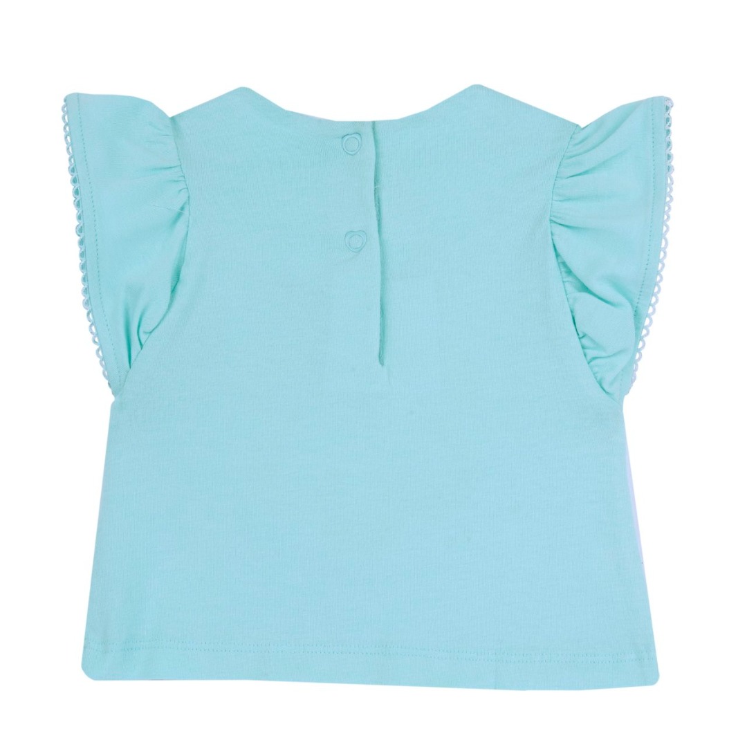 T-shirt senza maniche per bambina verde acqua con volant sulle spalle e ricamo di un fiore con applicazione in organza. Include chiusura posteriore con bottone per maggiore facilità d’uso.