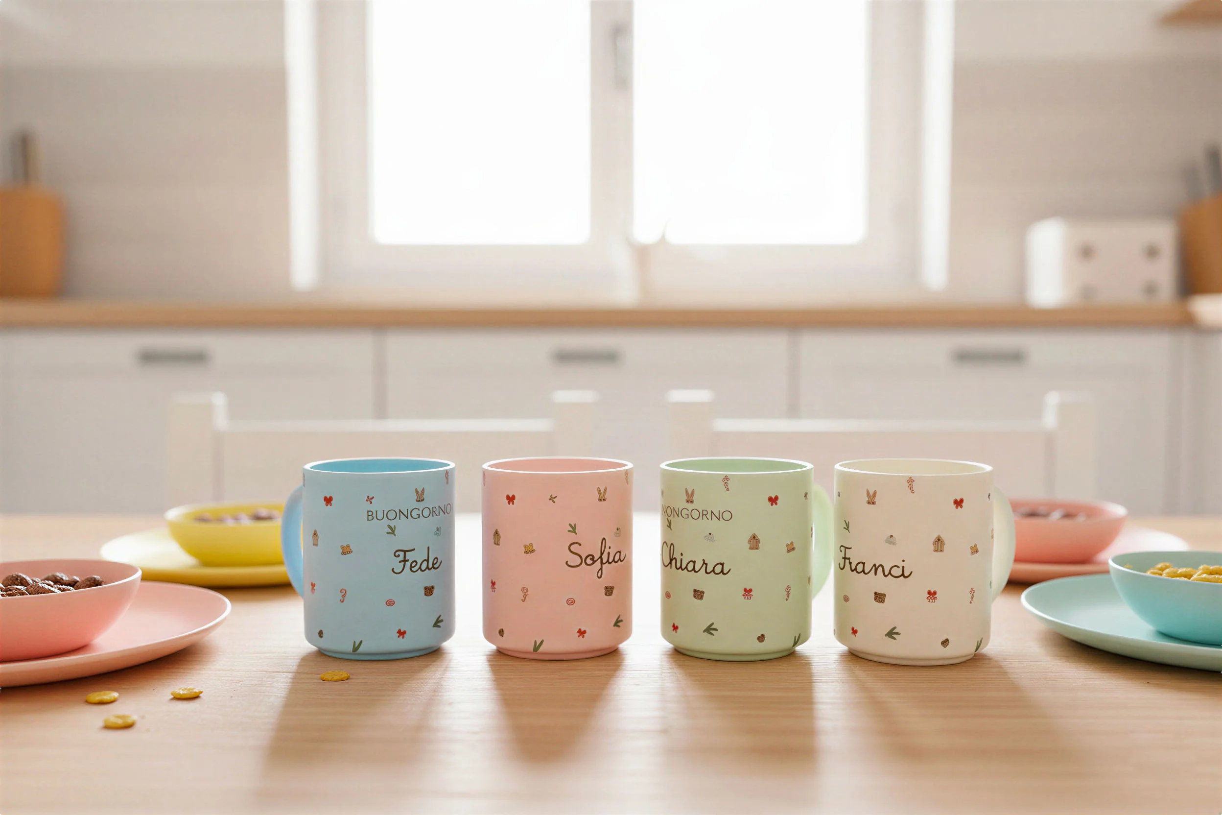 Tazza in ceramica opaca colori pastello personalizzata con grafica e nome e perfetta per iniziare la giornata con un sorriso. Ideale come regalo o semplicemente per sorprendere il tuo bambino.