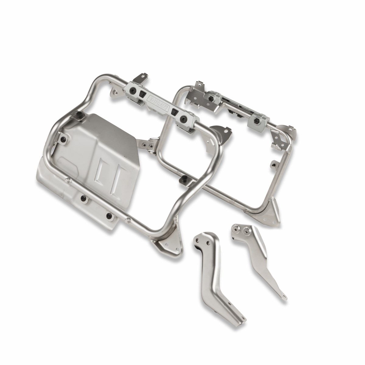 Coppia di pratici accessori che consentono il montaggio delle valigie laterali in alluminio sulla Multistrada V4. Sistema sviluppato con materiali di alta qualità e dotato di struttura robusta per offrire un'ottima stabilità alle valigie laterali; garantisce una estrema facilità di montaggio. Resistenza e design si sposano perfettamente con il profilo della moto, rendendo queste staffe il compagno ideale per ogni avventura su due ruote.