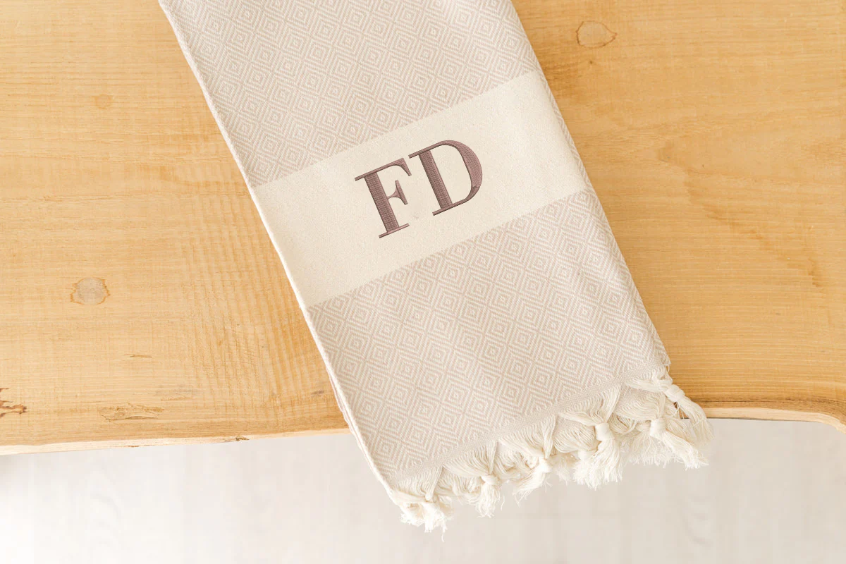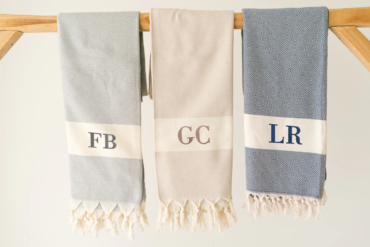 Telo mare “peshtemal” personalizzato a ricamo con nome o iniziali. Perfetti per il mare e la spiaggia. Tessuto in cotone di ottima qualitร , morbido e assorbente. Il ricamo sarร nella fascia centrale in basso nei seguenti colori: grigio nel telo mare grigio, blu nel telo mare blu e marrone nel telo mare sabbia.