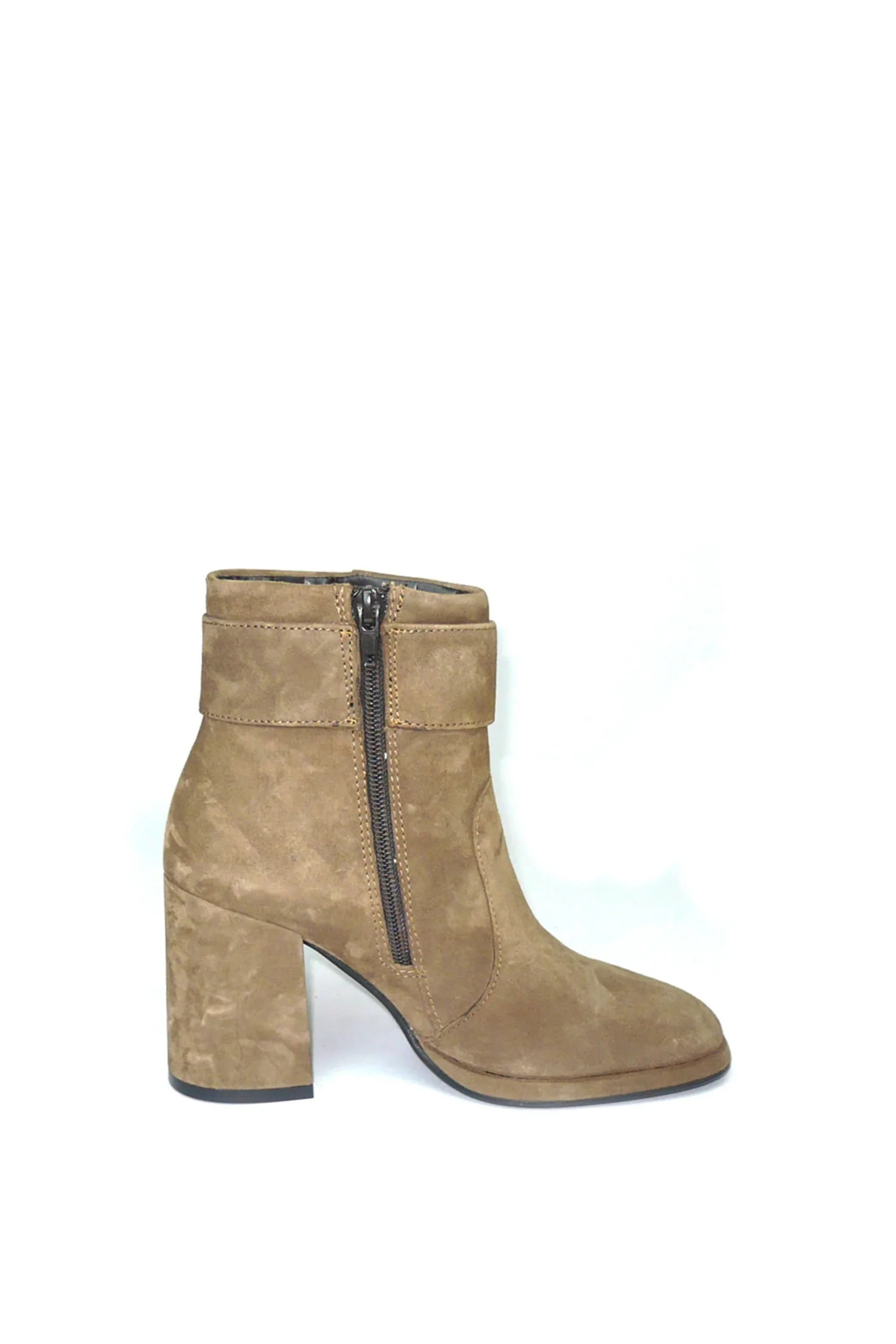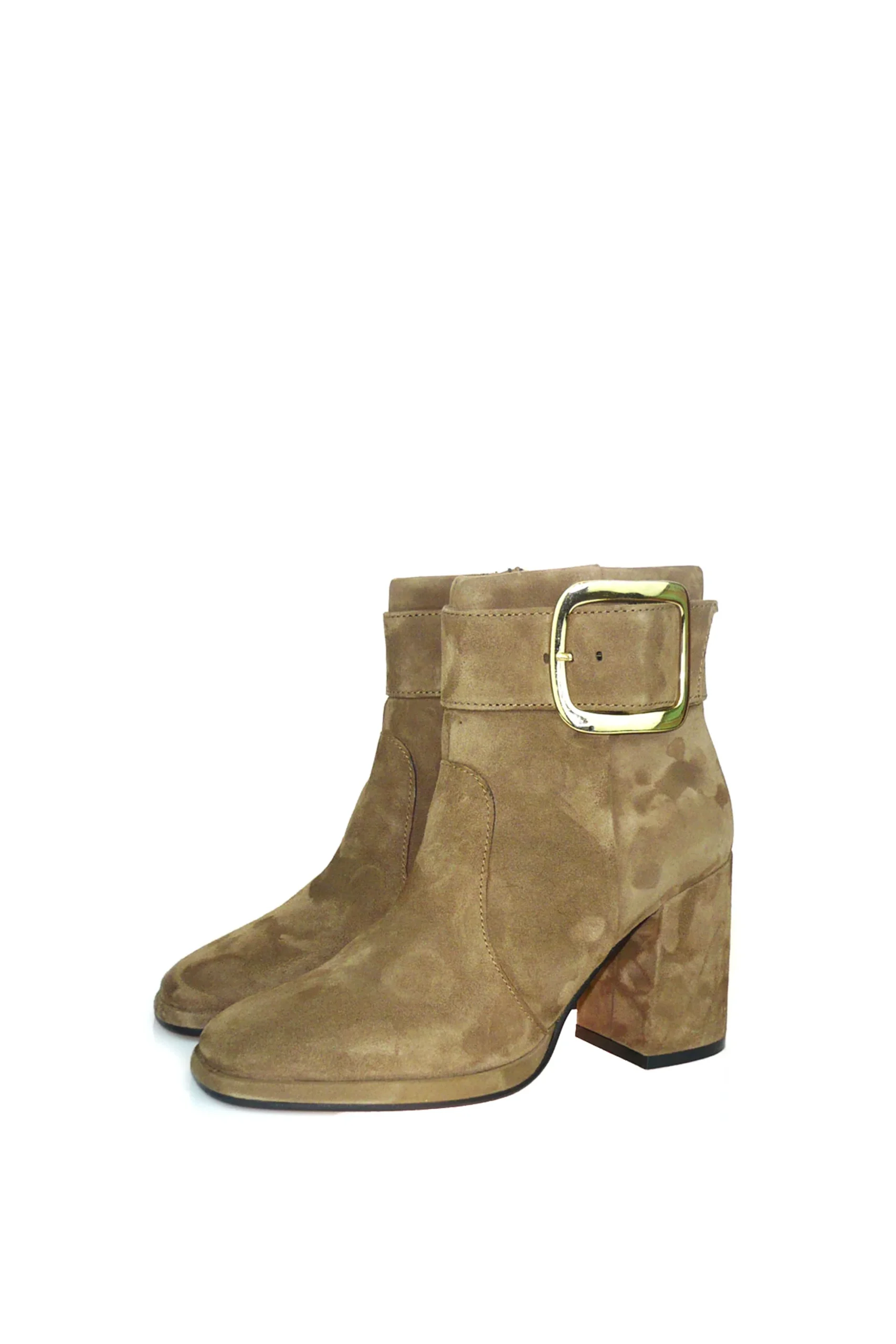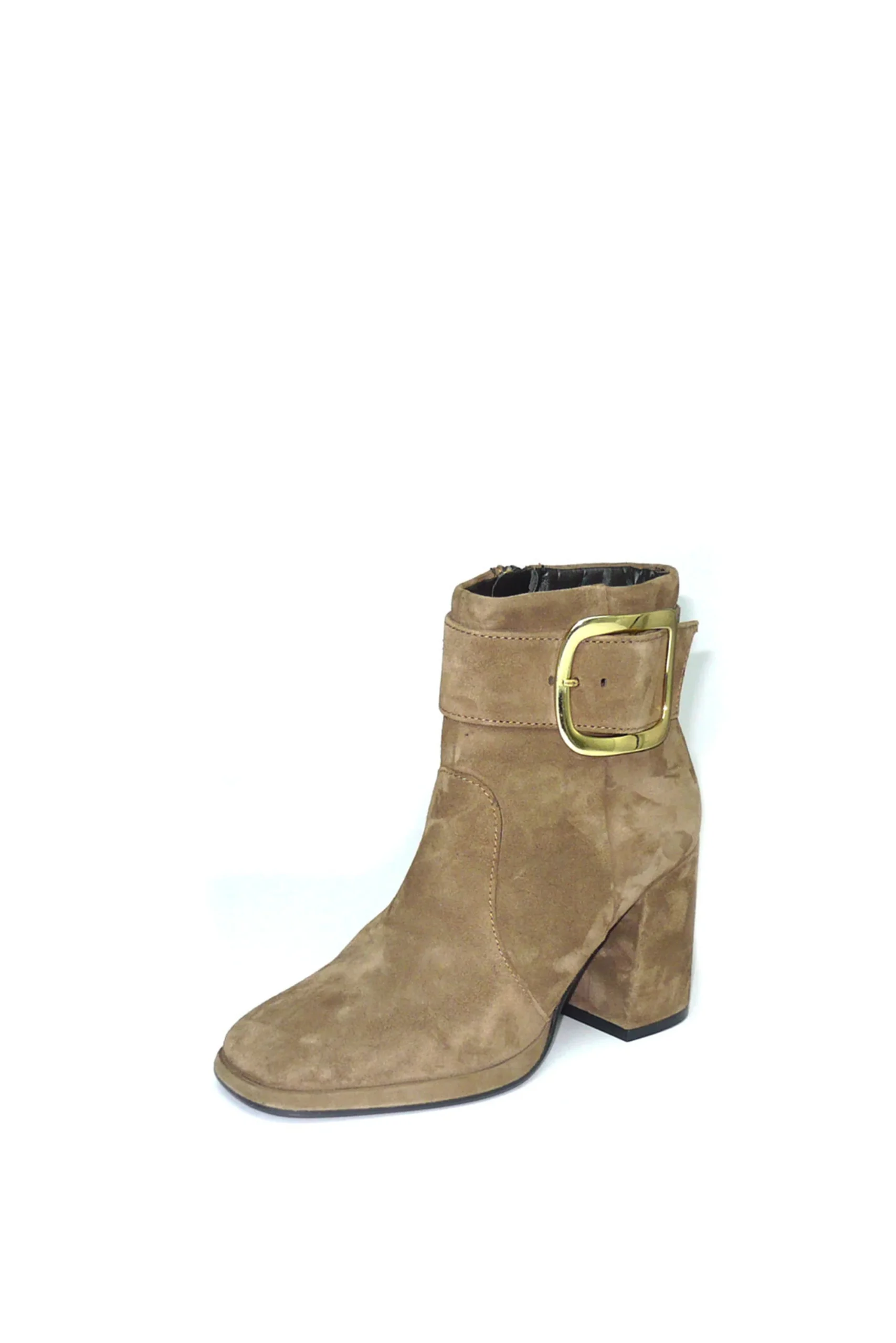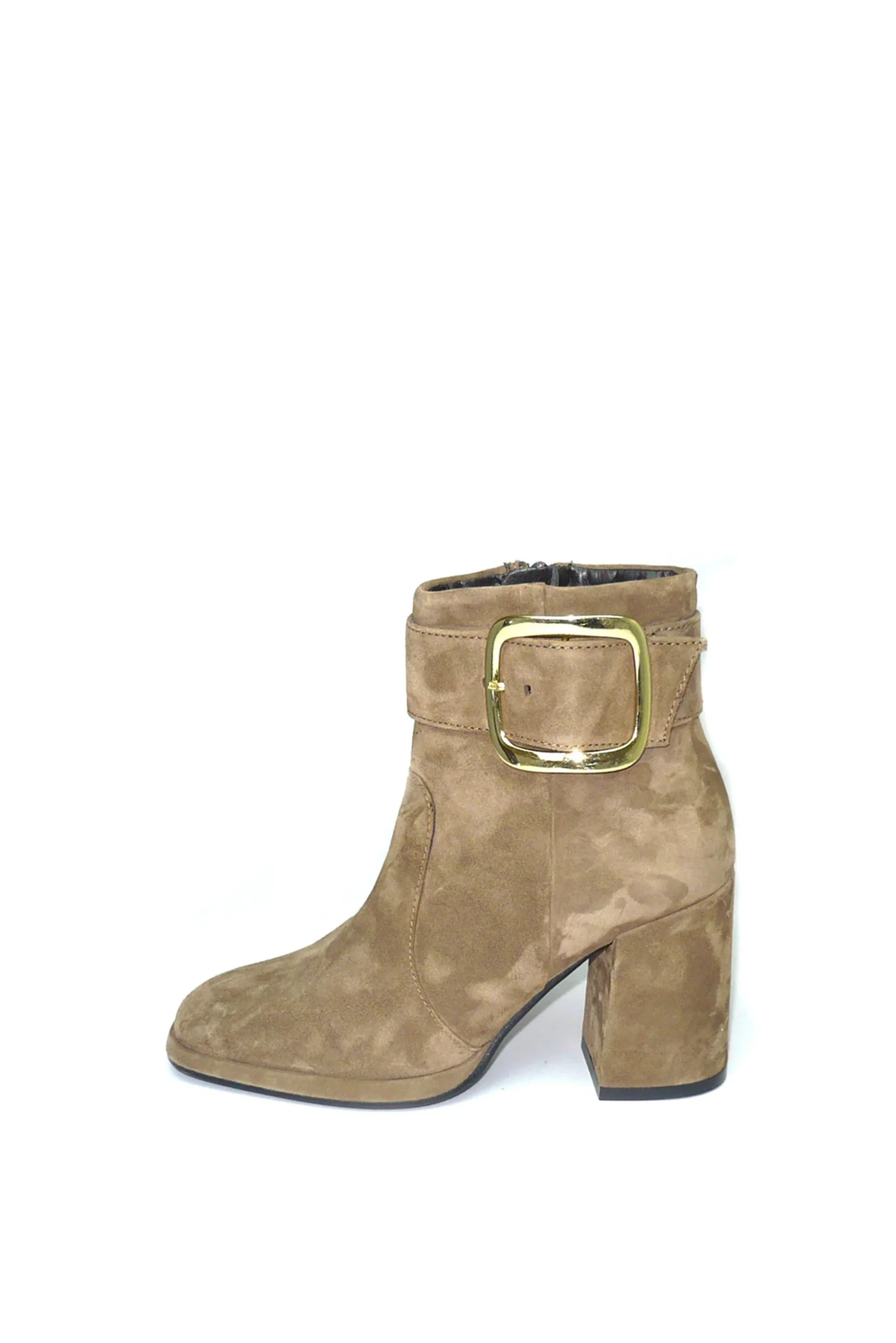 Stivaletto in morbido camoscio color taupe con fibbia design. Punta squadrata, tacco doppio e alto, la tendenza dell’inverno racchiusa in un modello comodo e versatile. CafèNoir