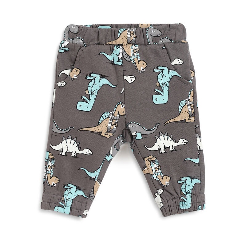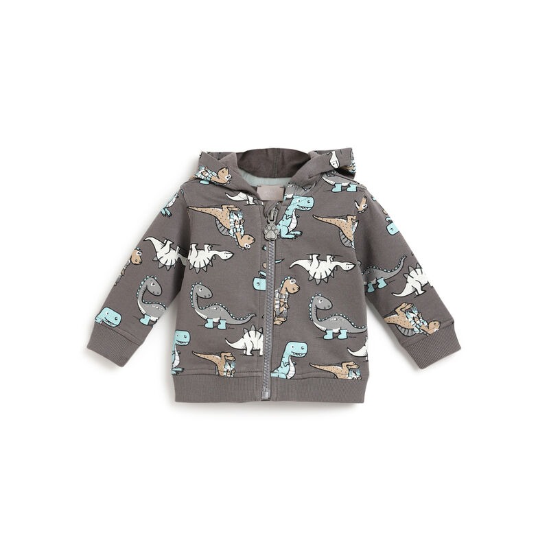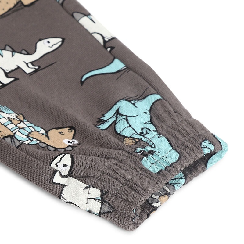 Tuta con cappuccio e pantaloni in felpa, fondo grigio con stampa di dinosauri.