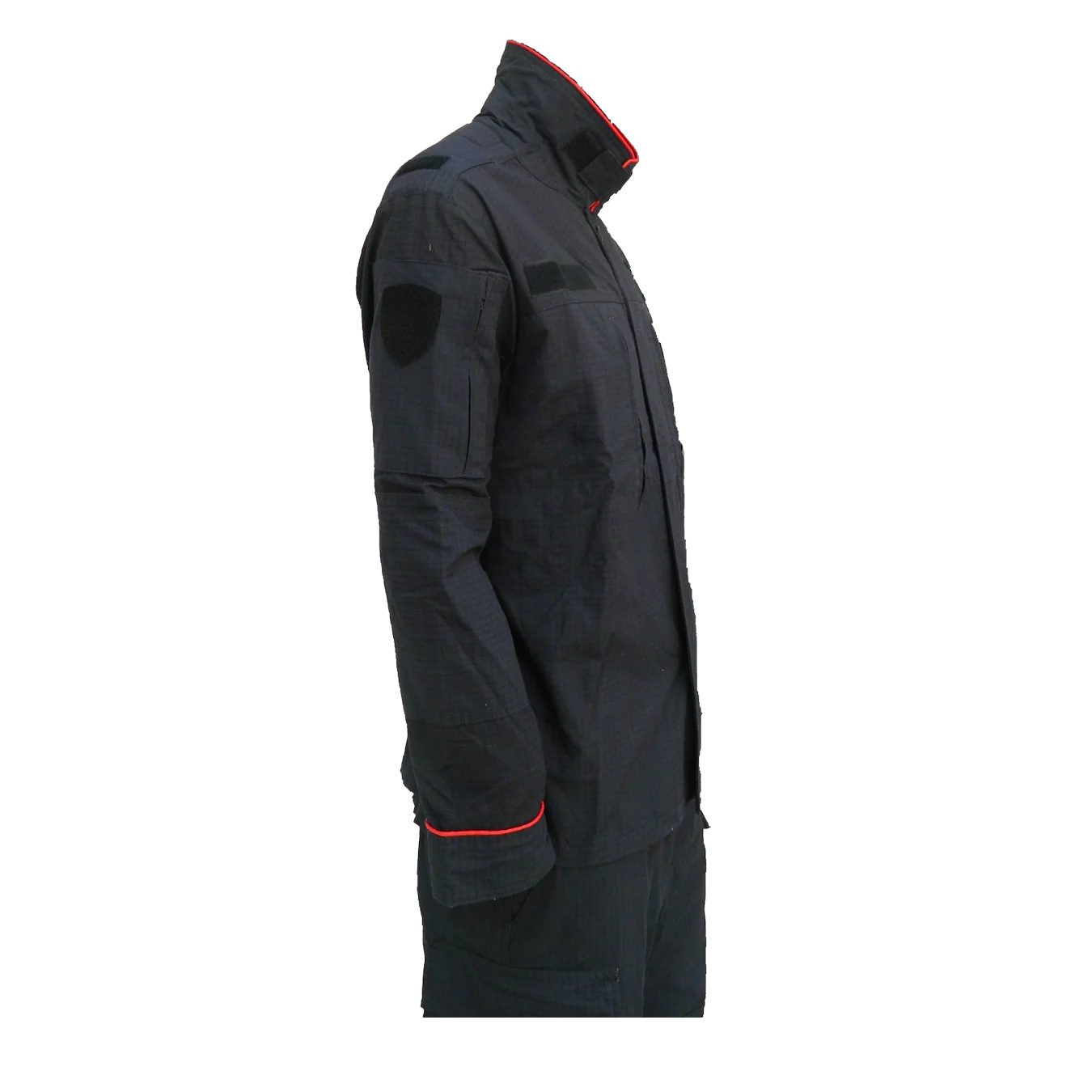 La Giacca ha il colletto con patella a bottoni, tasche pettorali, tasche su braccio, portagrado, rinforzo ai gomiti, velcri per applicare le patch.