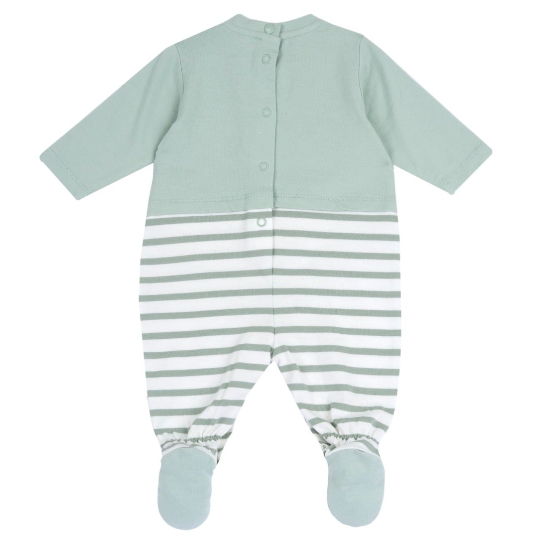 Tutina in jersey di cotone a maniche lunghe bicolore verde e stampa a righe bianche e verdi. Include grafica ricamata sul petto con bottoncino effetto legno, e chiusura con bottoni automatici sul retro e sul cavallo per facilitare il cambio.