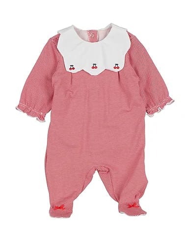 Tutina a manica lunga in jersey per neonata con stampa a righe bianco e rosso, collo largo bianco e ciliegie ricamate.
