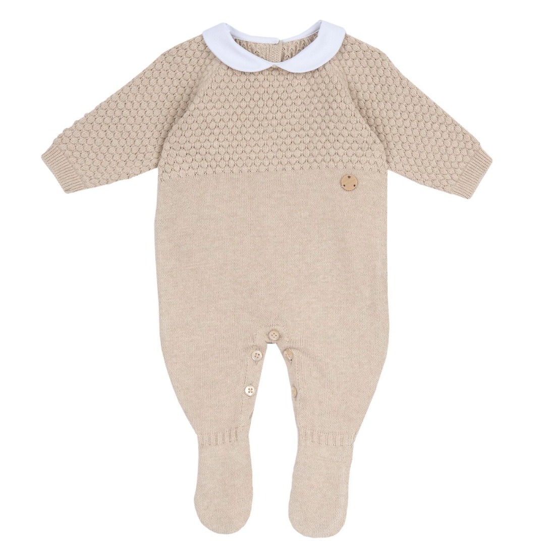 Tutina in maglia lavorazione con giochi di punti di colore beige, con medaglietta effetto legno.