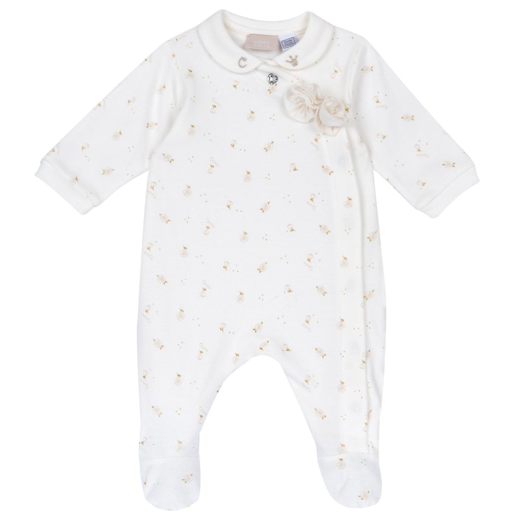 Tutina bianca in interlock con stampa fantasia effetto lurex, collo ricamato con filo luminoso.