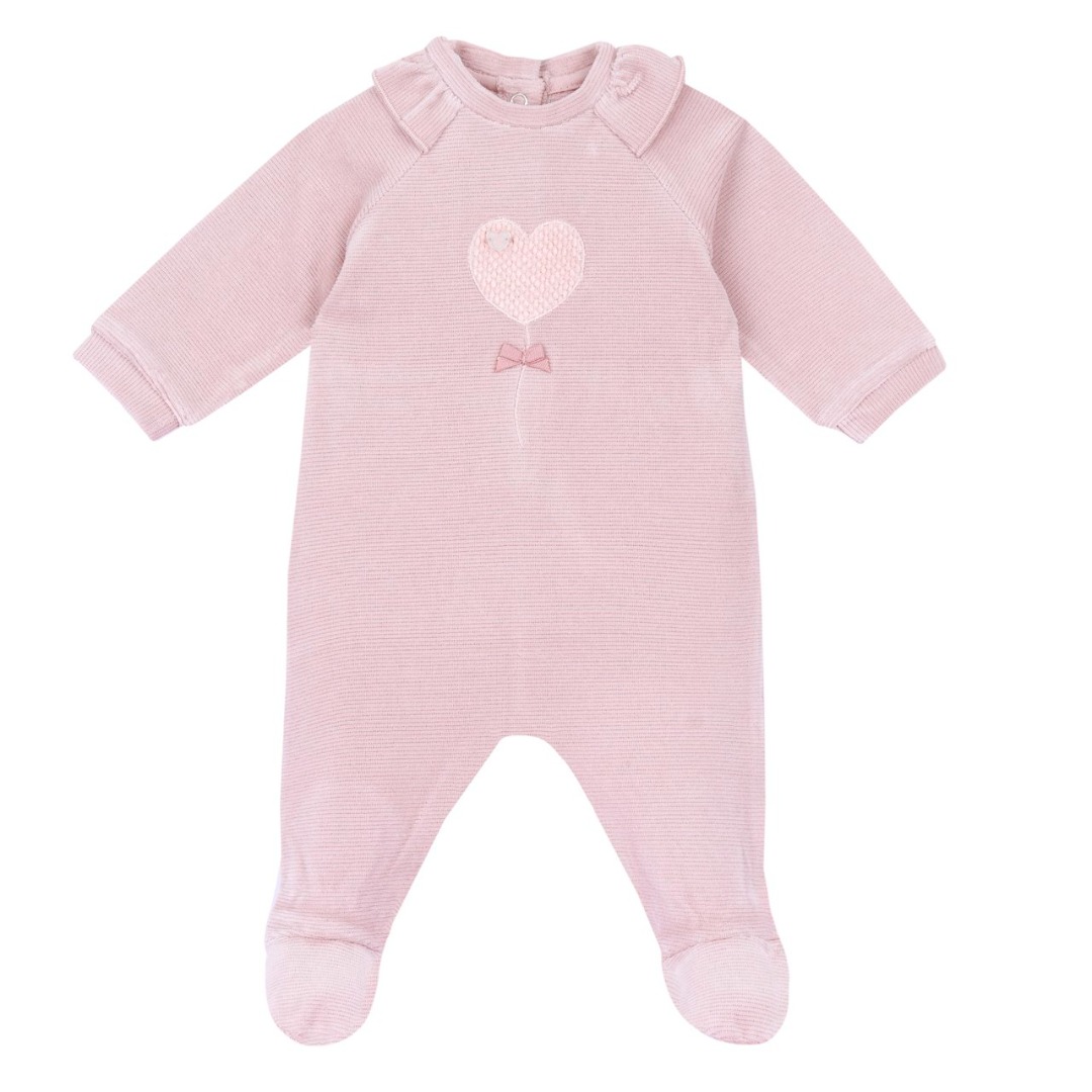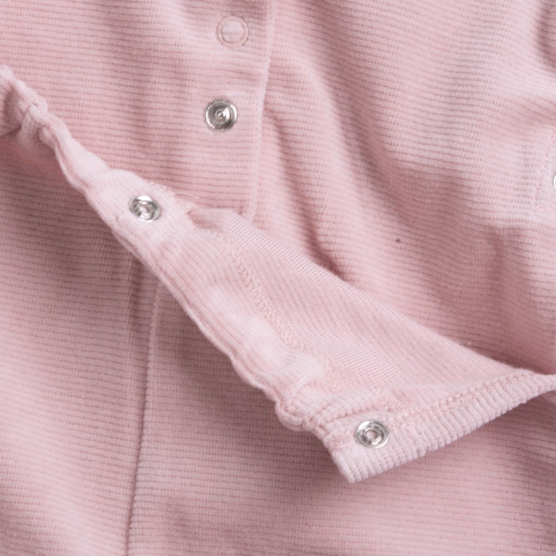 Tutina girocollo in ciniglia rosa a coste, grafica ricamata con applicazione in tessuto caldo e medaglietta effetto madreperla.