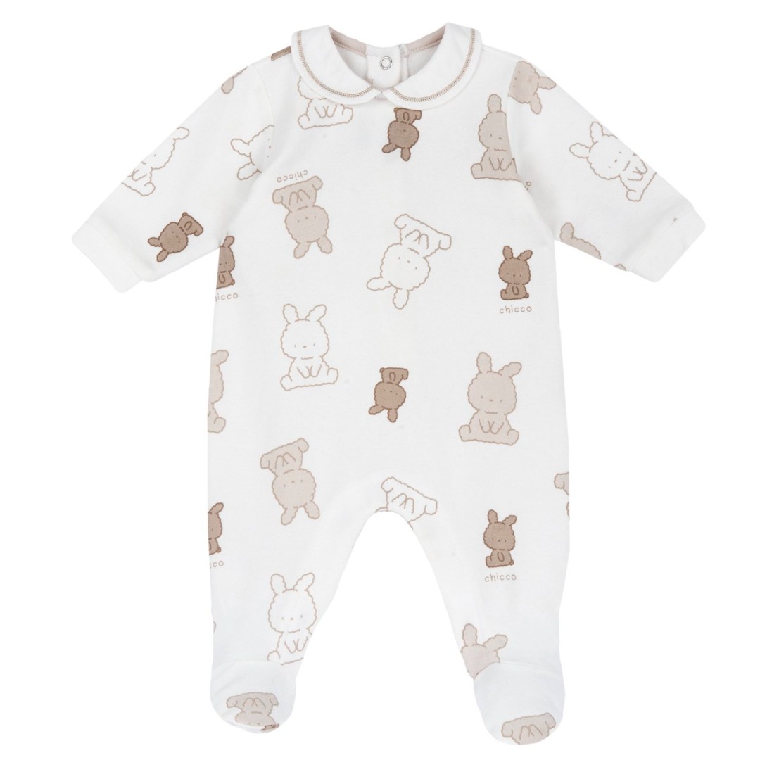 Tutina in felpa elasticizzata bianca con stampa fantasia di sagome di coniglietti nei toni del beige.