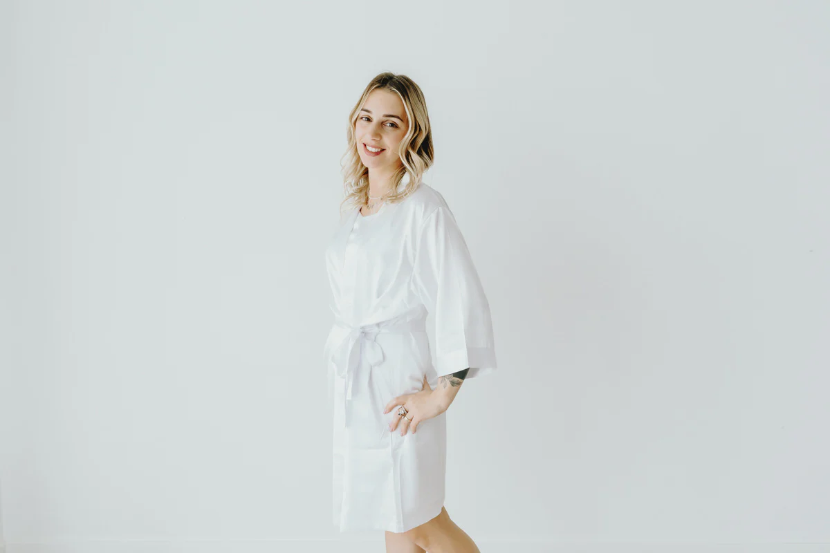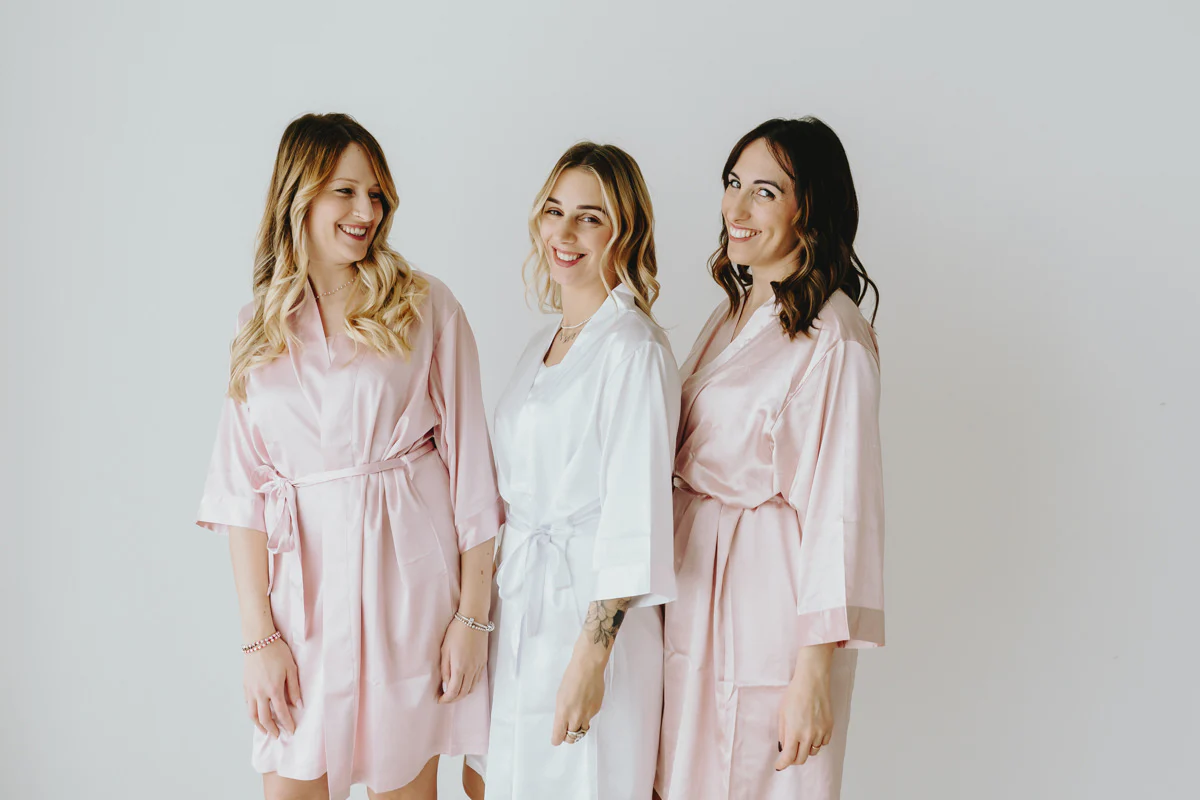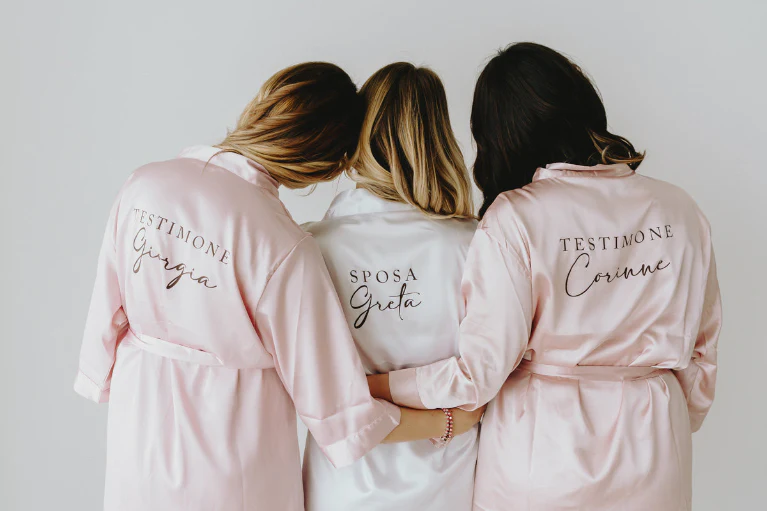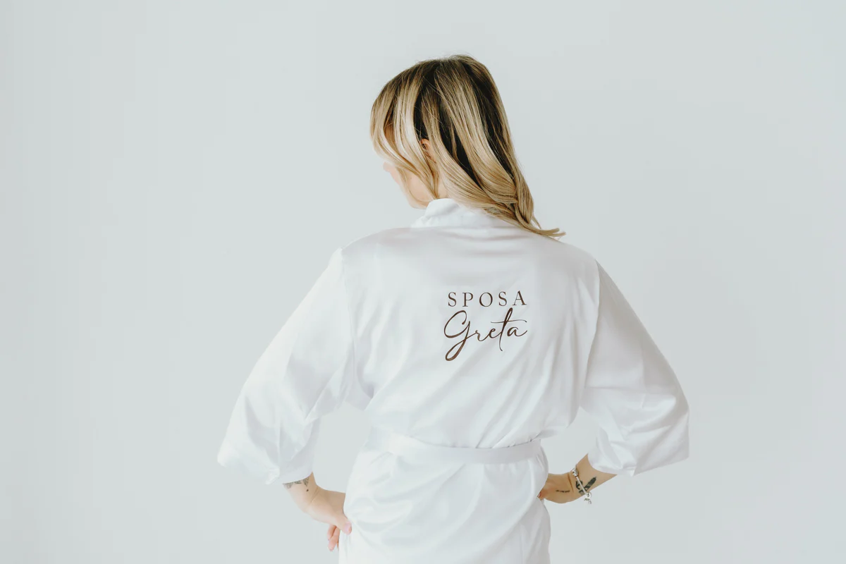 Vestaglia in raso di alta qualità completa di cinturino. Perfetto per i preparativi del tuo matrimonio. Scegli tra i due colori disponibili, aggiungi, se vuoi, la personalizzazione e rendi indimenticabile il tuo giorno più bello.