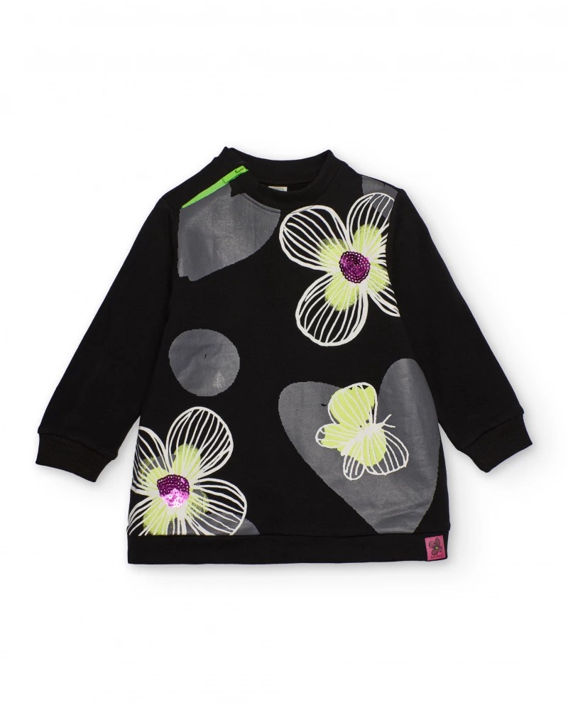 Abito per bambina in morbida felpa di colore nero, presenta una stampa floreale nei toni del bianco, lime e lilla con dettagli di paillettes al centro dei fiori.