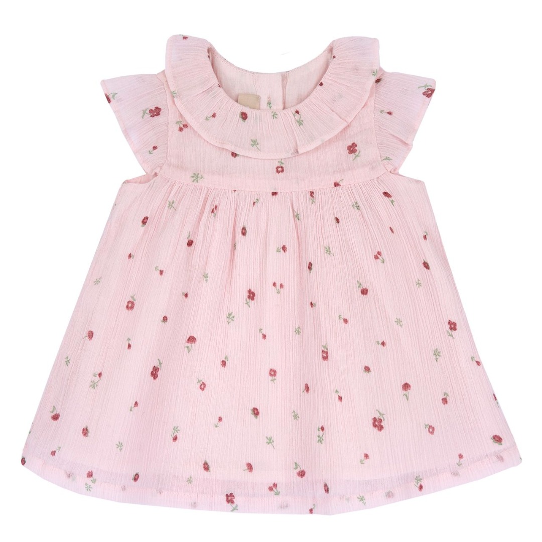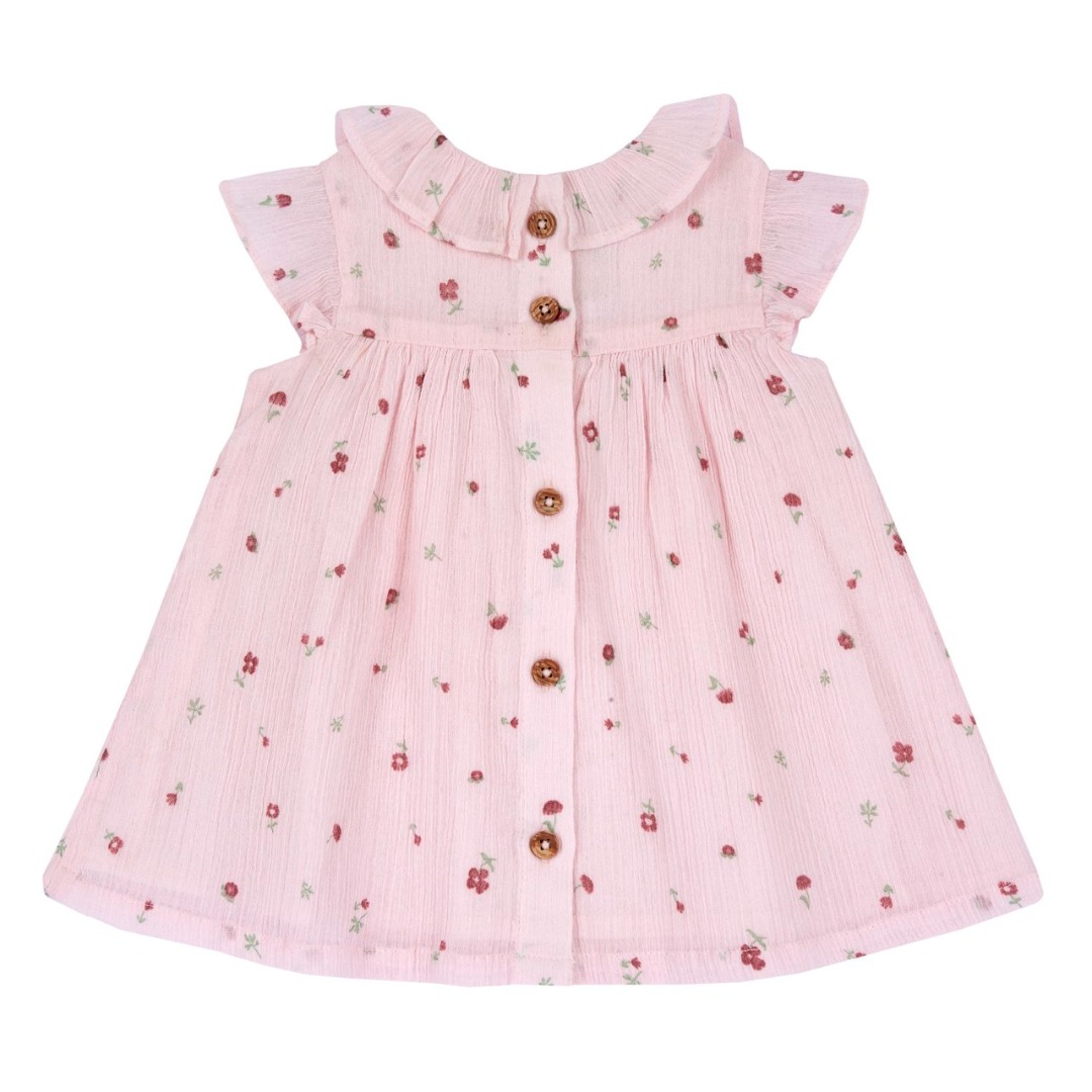 Vestito in garza di cotone groffata per bambina di colore rosa con fiorellini stampati e colletto a volant. Il design include maniche con volant, un taglio in vita e una chiusura a bottoni effetto legno sul retro per facilitarne l’uso.