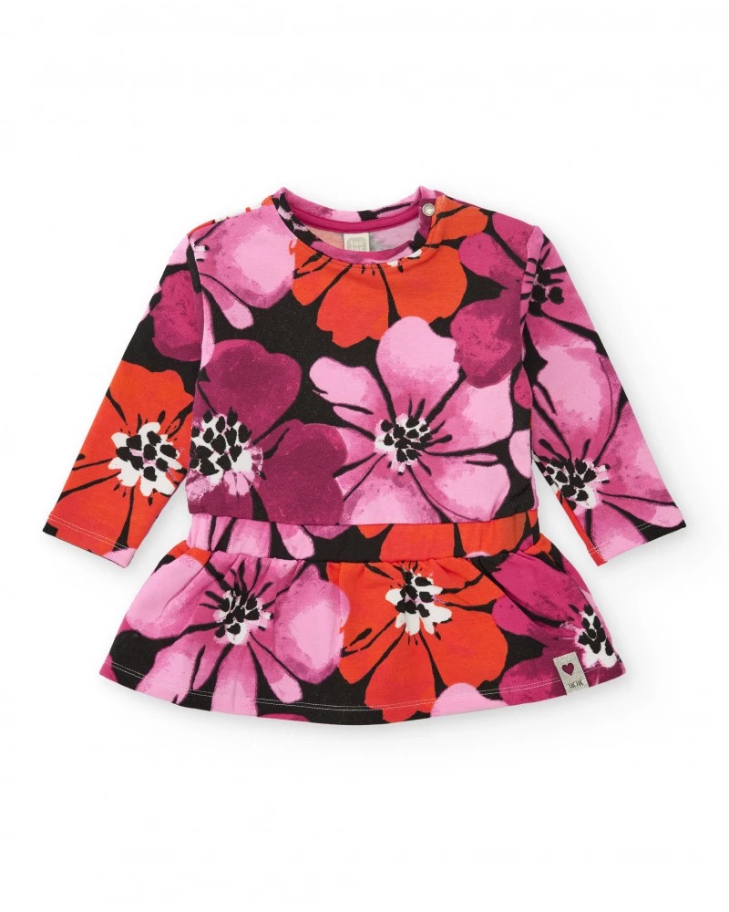 Vestito a maniche lunghe per bambina con vivace stampa floreale nei toni del fucsia, rosa, rosso e nero.