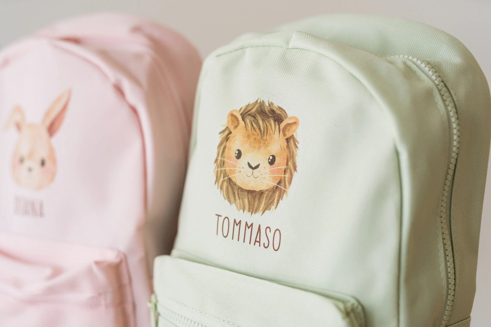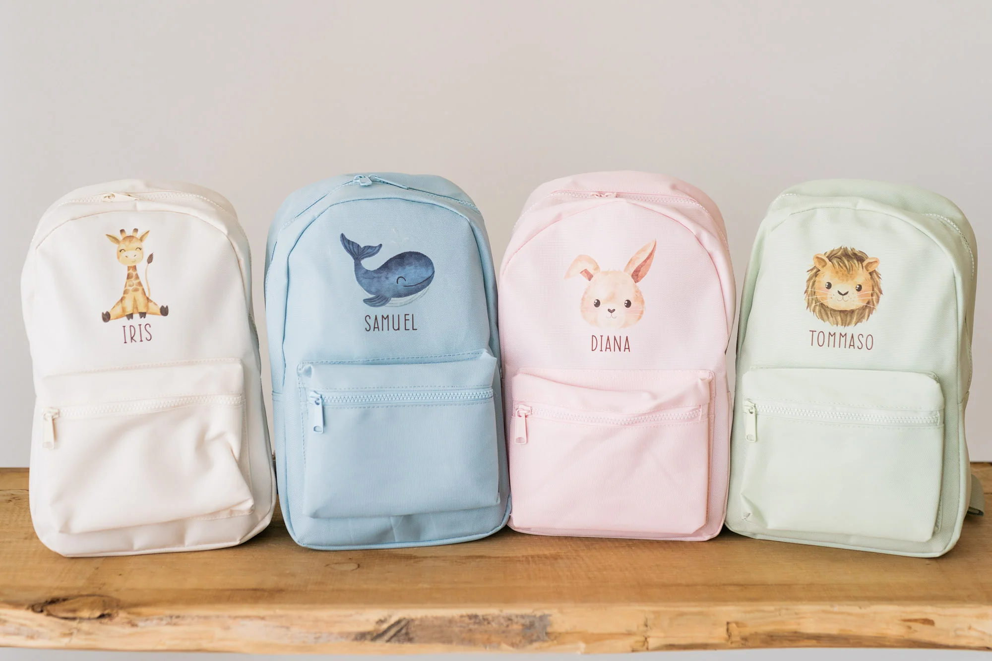 Zainetto personalizzato con il nome e le illustrazioni di Mimรฌ. Perfetto per la scuola, lโ€™asilo o semplicemente per le gite fuori porta. Rendi unico il primo giorno di asilo, del tuo bimbo o bimba con questo fantastico zainetto che sfoggerร  con grande orgoglio! Zaino in poliestere con spalline regolabili, tasca frontale con zip, pannello posteriore imbottito. Dimensioni: 23 x 35 x 12 cm, capacita’: 7 litri.