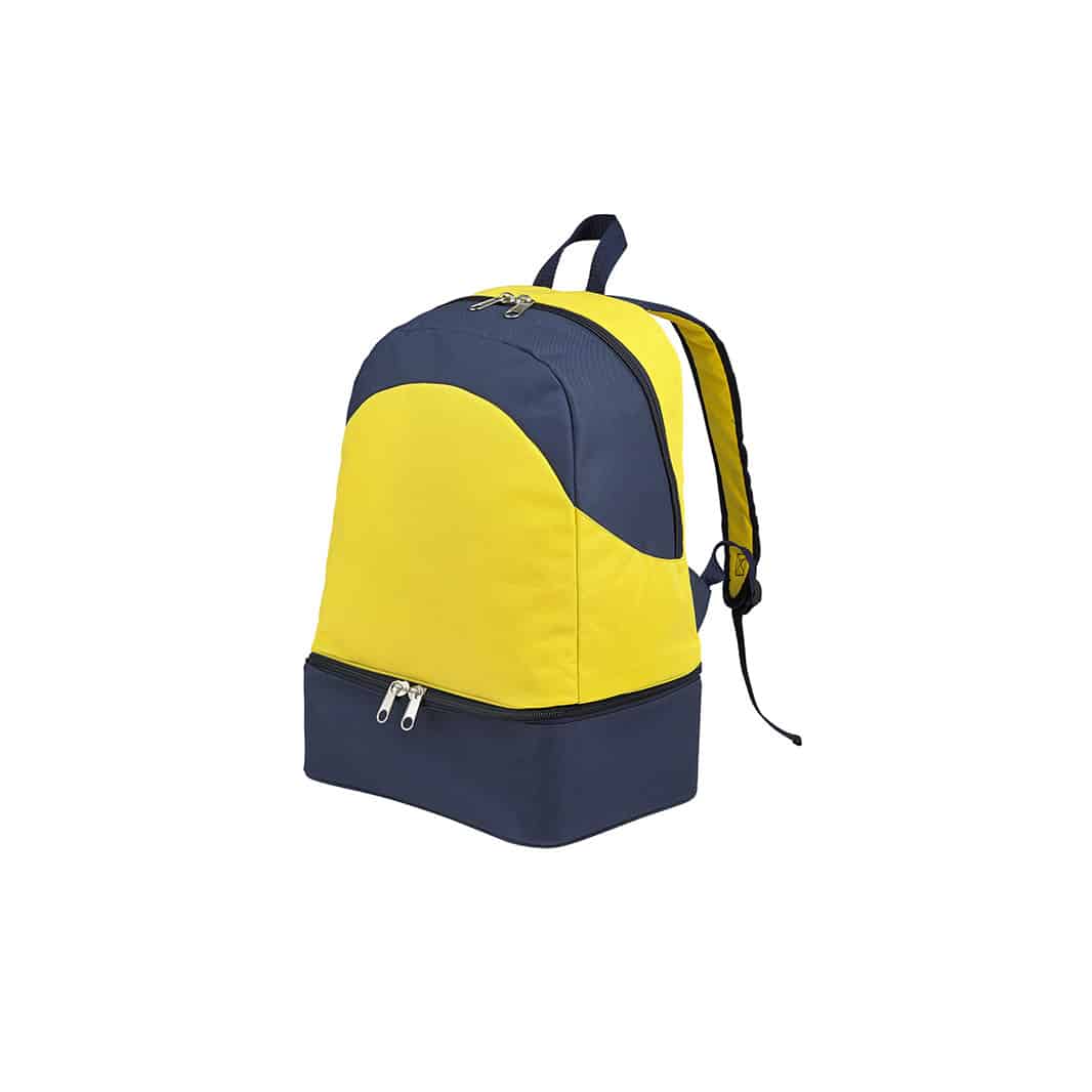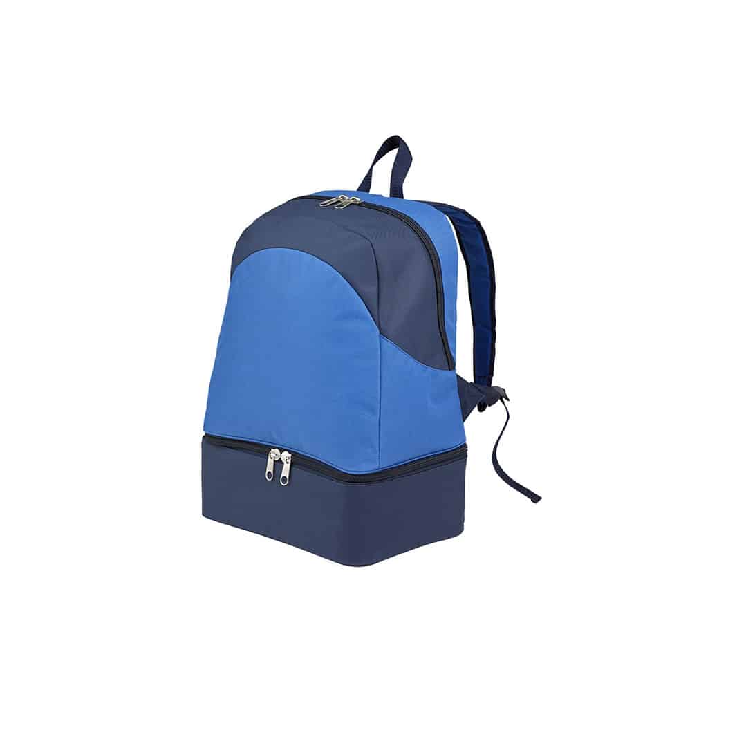 Zaino bicolore con doppio fondo, ampio scomparto, retro imbottito e spallacci regolabili.