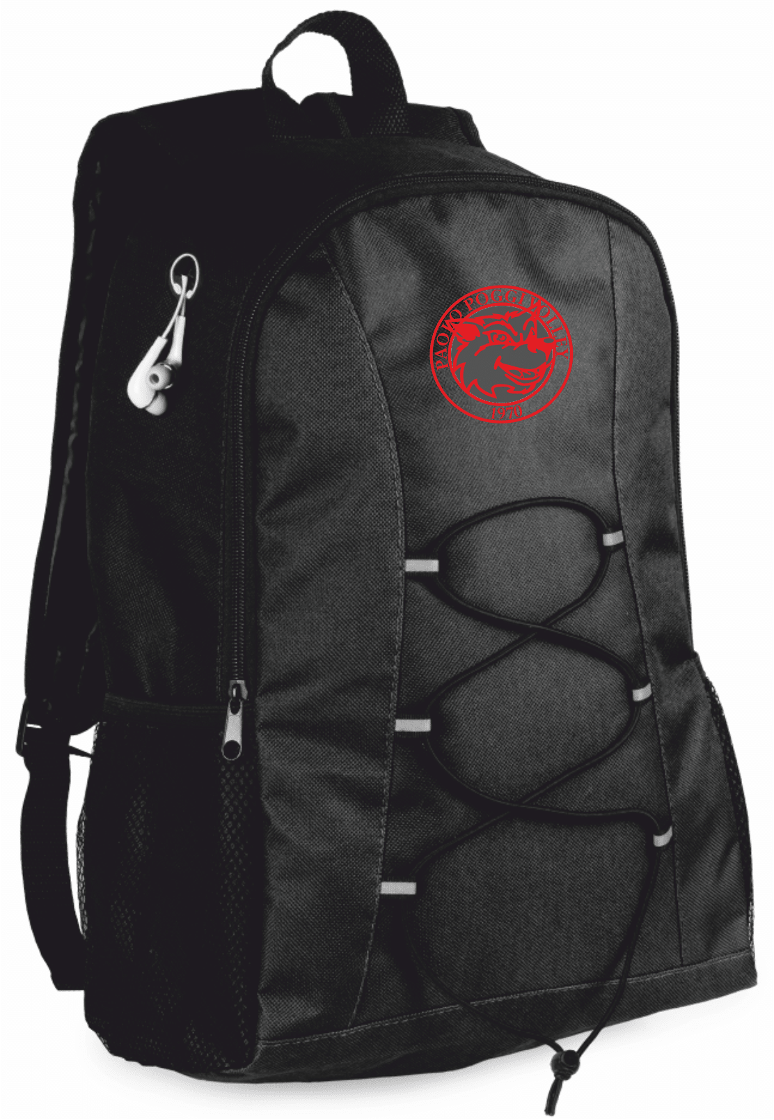 Zaino in poliestere 600D disponibile in vari colori, con chiusura a cerniera, uscita per cuffie, stringhe elastiche davanti con supporti riflettenti e tasche a rete elastiche ai lati. Schienale imbottito e spallacci regolabili con imbottitura. Confezionato singolarmente in polybag.