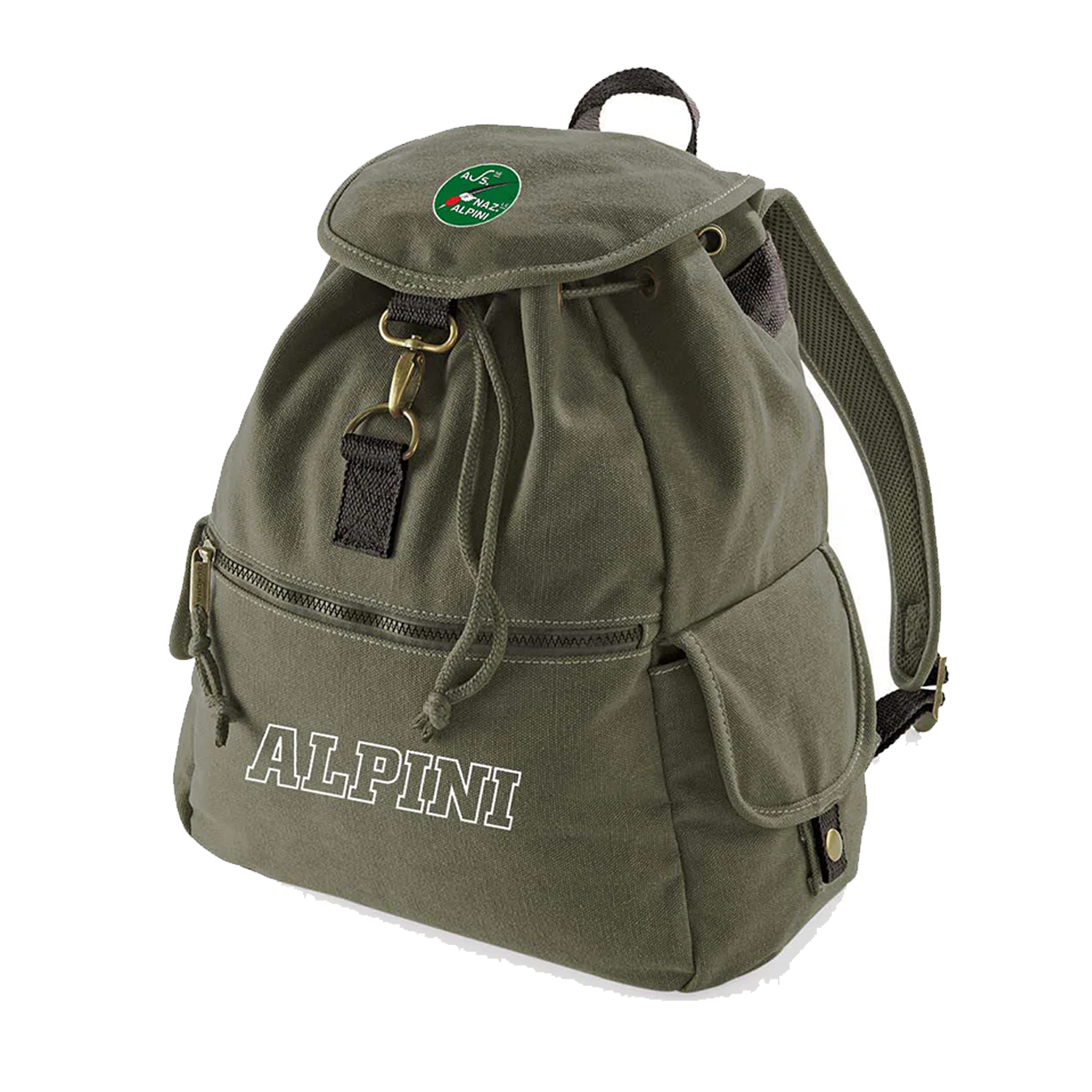 Zaino con ricamo frontale scritta ALPINI e ricamo logo ANA nella parte superiore, 100% cotone Canvas. Zaino in stile vintage con chiusura principale con cordoncino, particolari in metallo anticato,